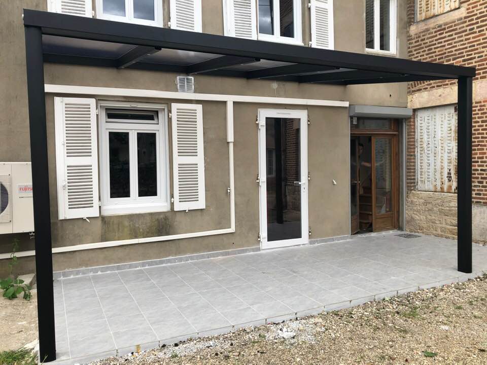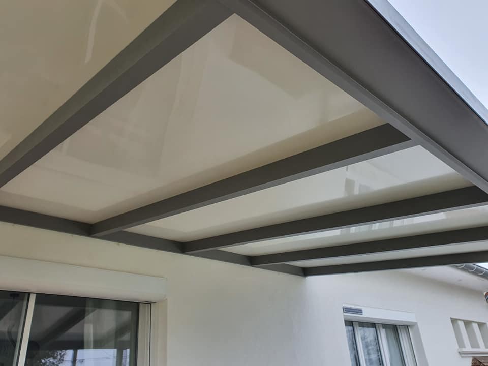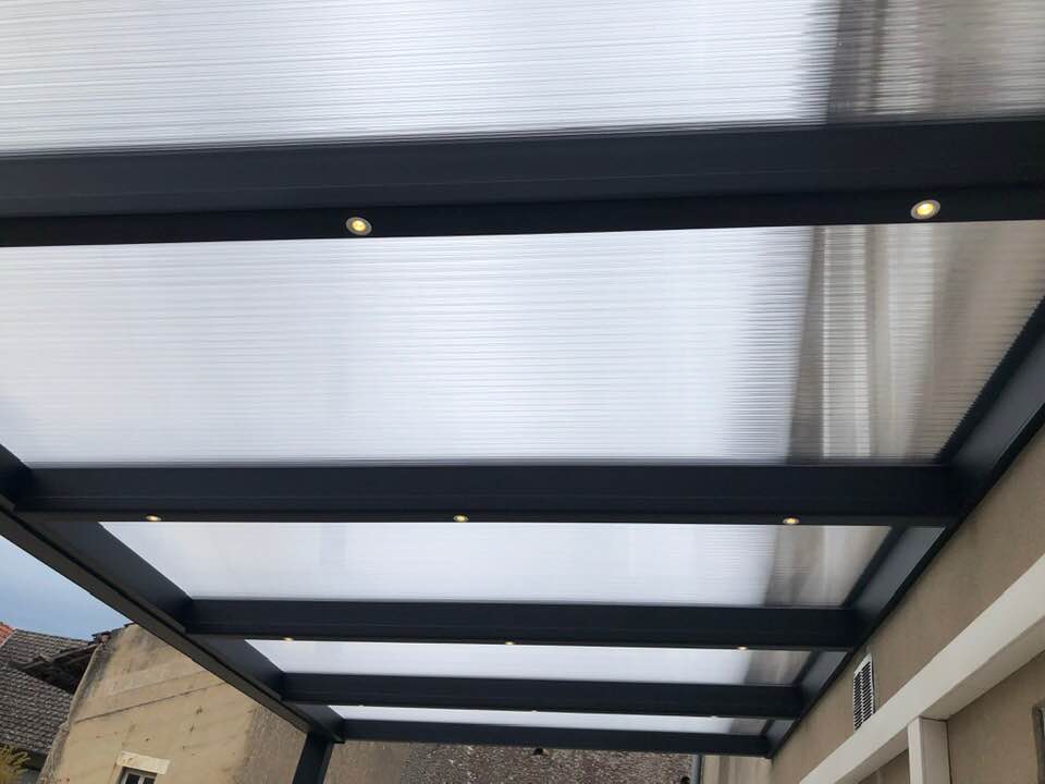 Pergola aluminium art home Alu menuiseries intégrant en toiture deux puits de lumières permettant l’apport de luminosité aux dessus des ouvertures de l’habitation 😌.