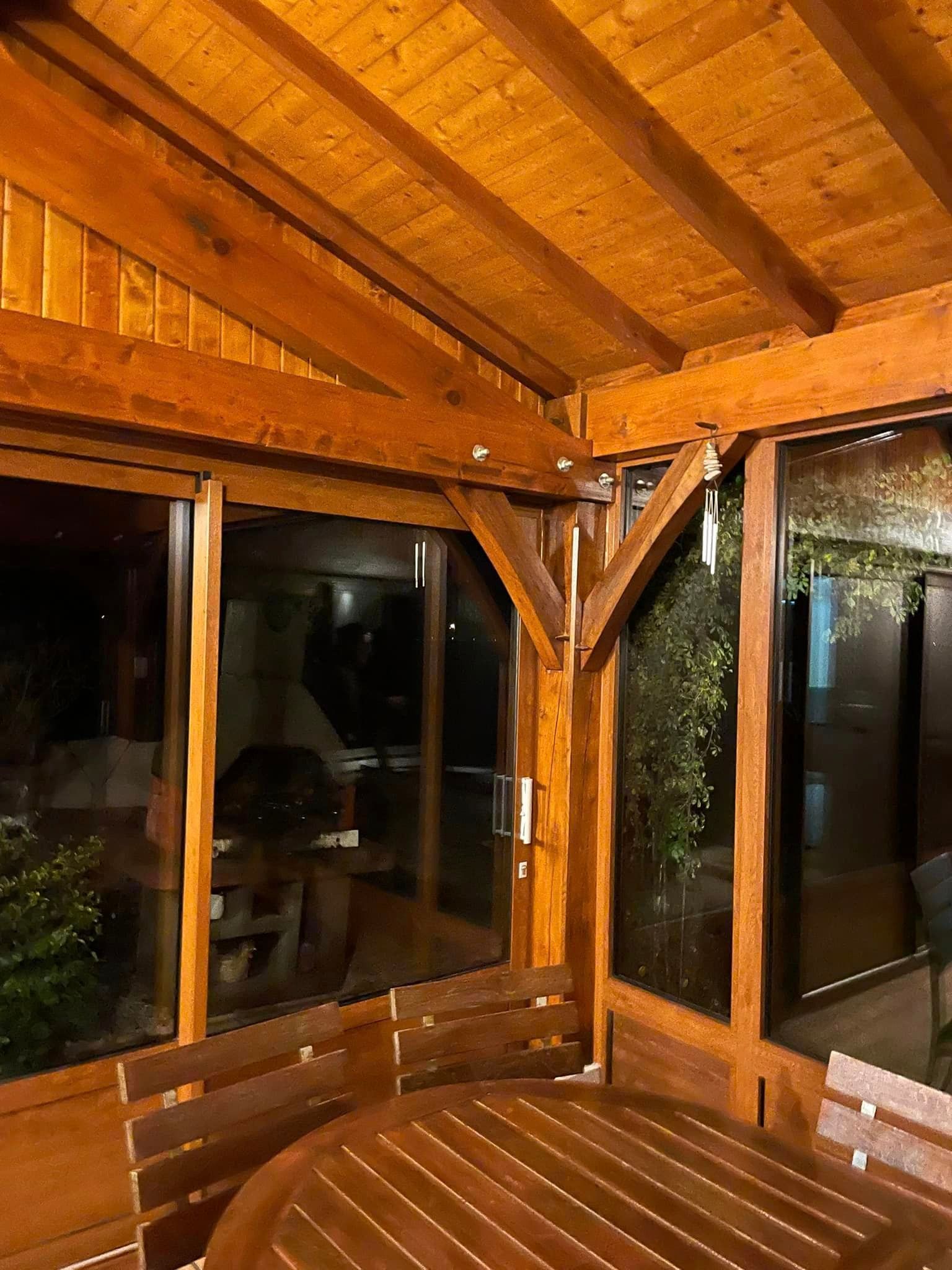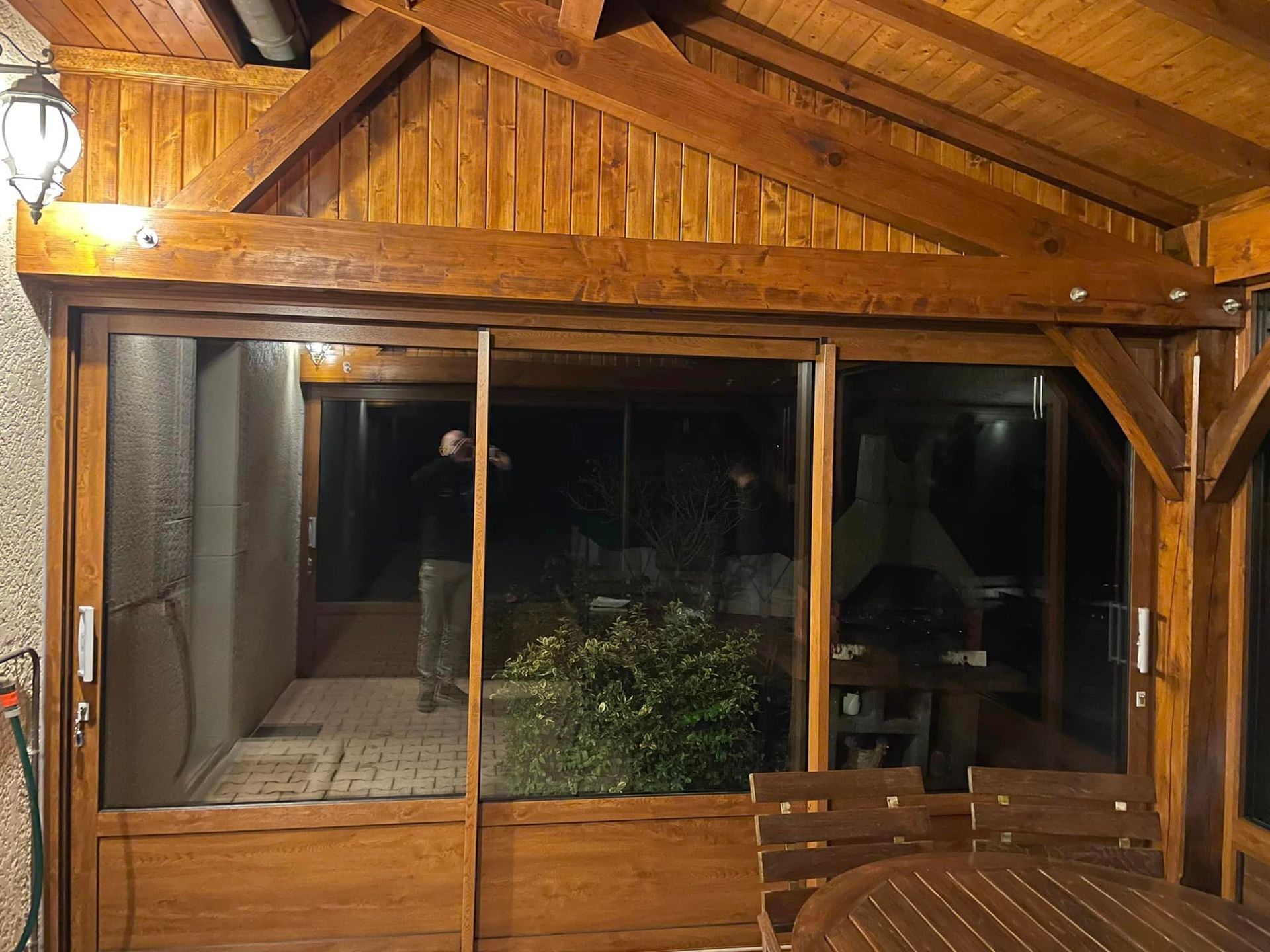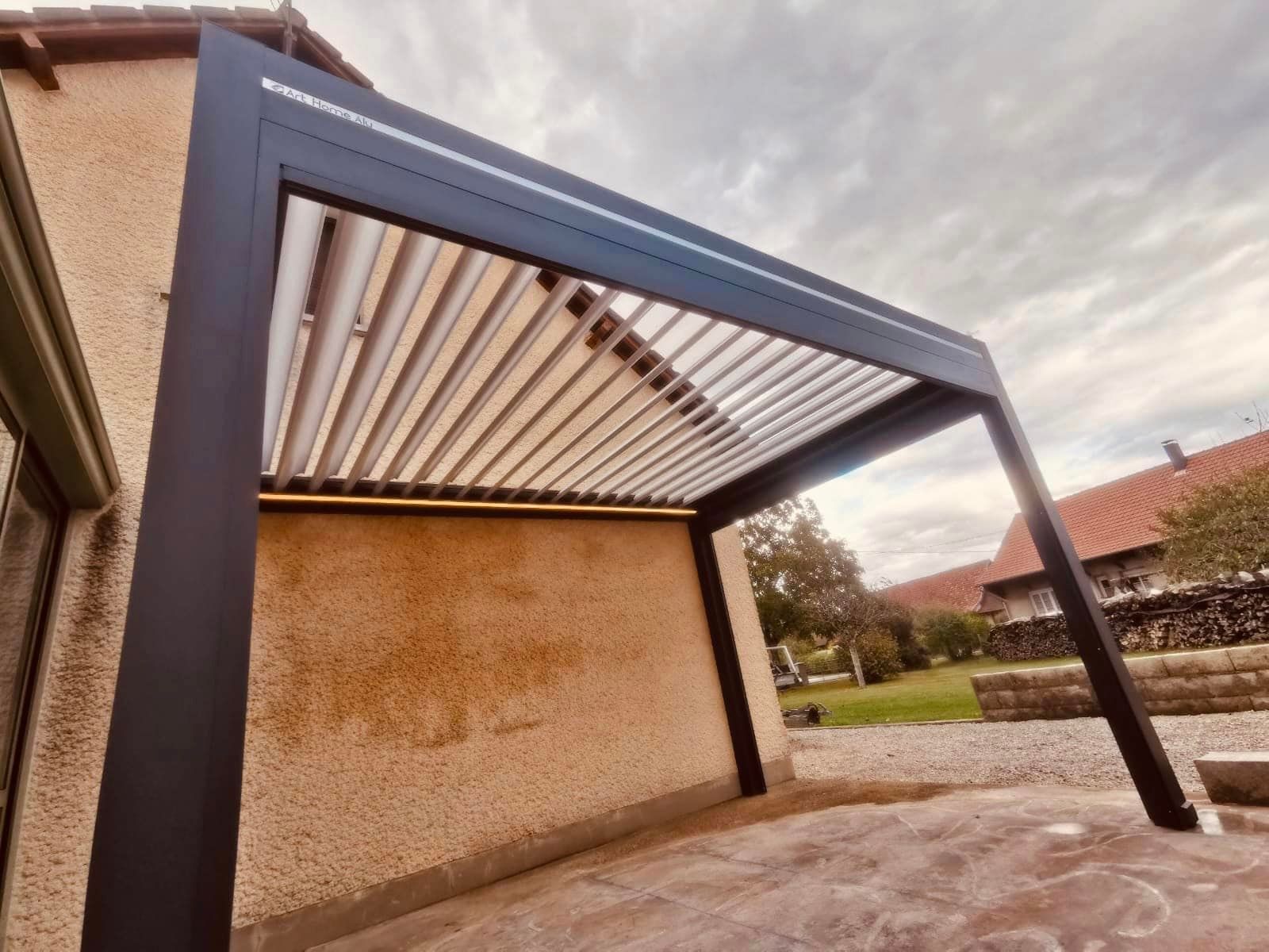 Au hameau « les Repôts » dans le Jura (39), installation finalisée de la pergola bioclimatique Art Home Alu, double attenante, c'est à dire pose en coin de mur avec 1 seul poteau extérieur !🤩
