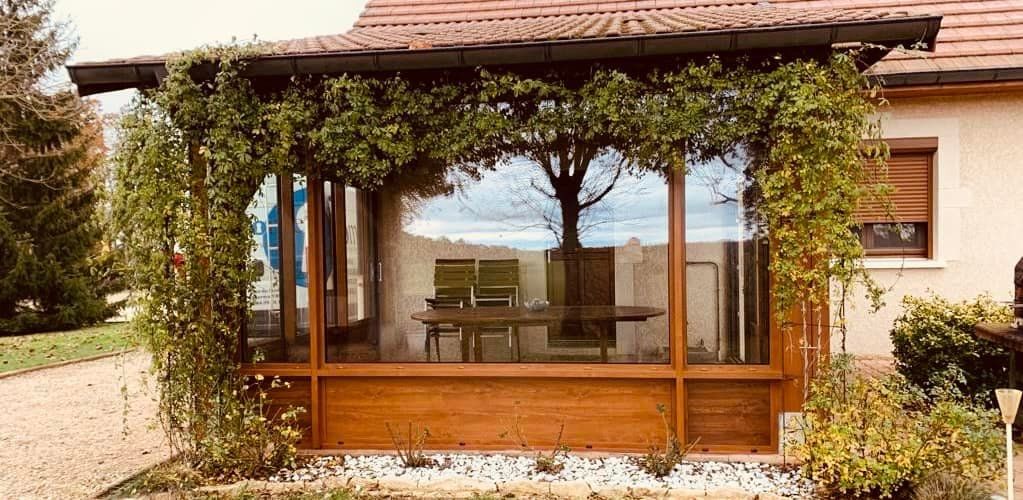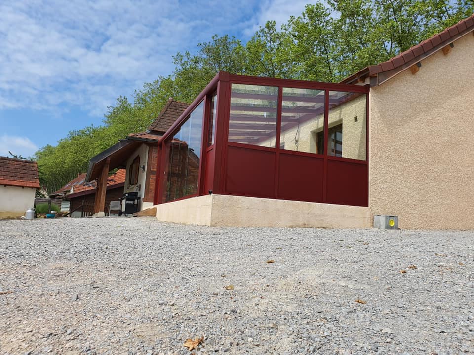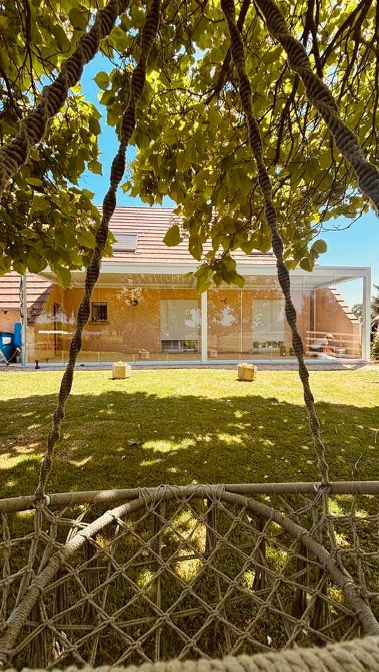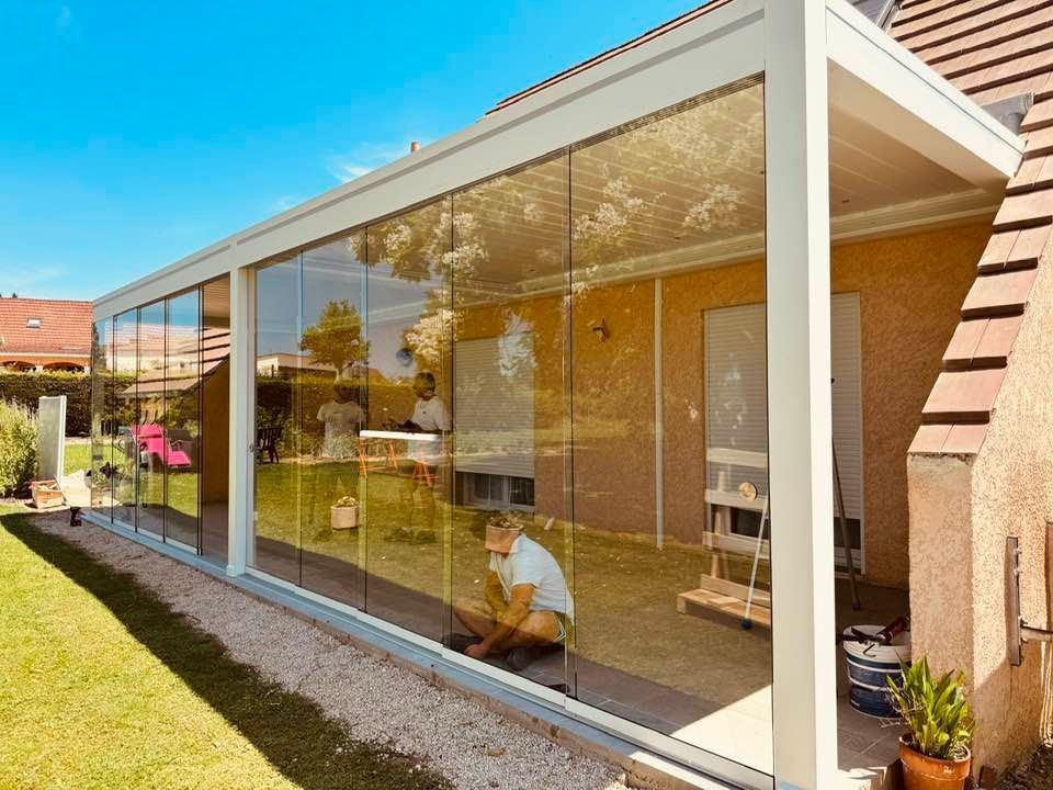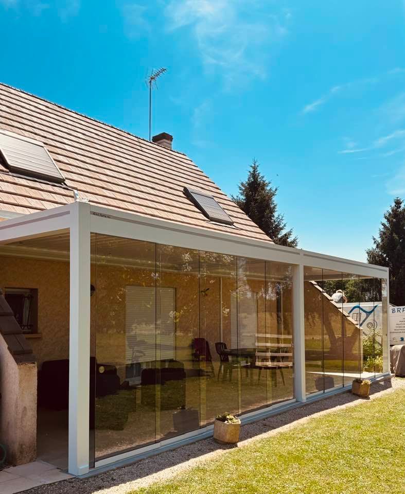 À Saint Germain du Bois (71) une pergola à toiture vitrée fraîchement posée trône sur la terrasse de nos clients 😊😎. Pergola créée sur mesure avec coulissants en verre trempé 4 vantaux 4 rails et face latérale fixe avec soubassement. Structure totalement en aluminium profilés "profil system" 100% français 🐓. Fabriquée chez notre partenaire art home menuiseries en Alsace 💪👍.