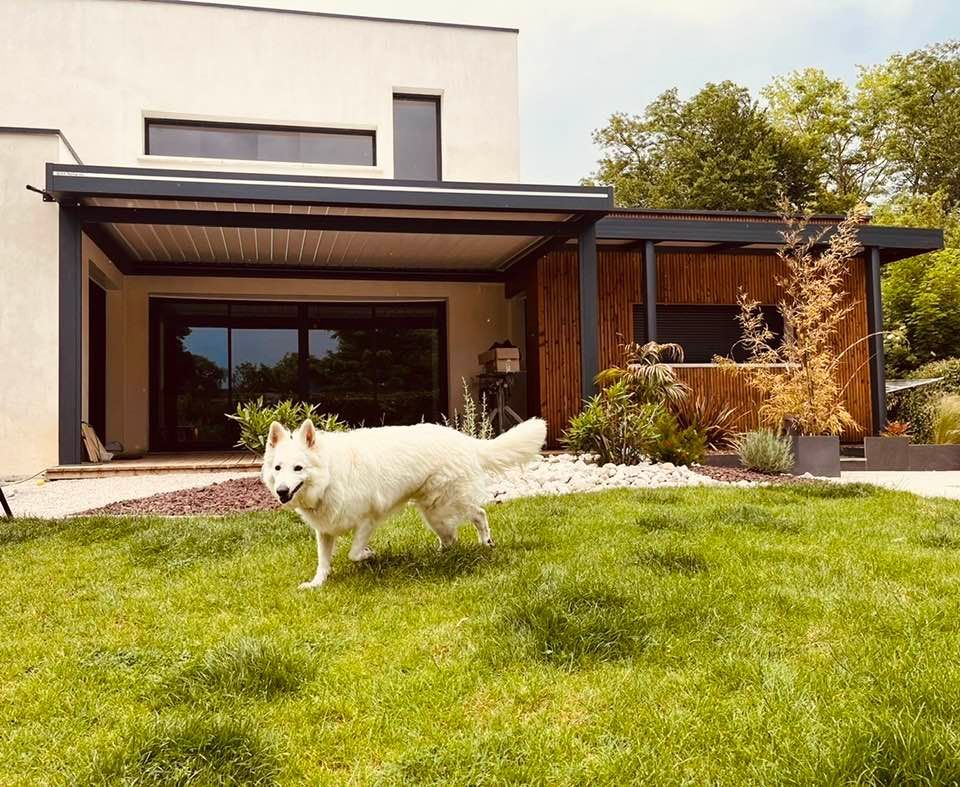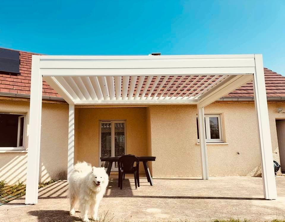 À Branges, pose et installation de cette jolie Pergola, sous le soleil de la Bresse 🤩, en présence d'un "toutou" fier de sa nouvelle pergola bioclimatique