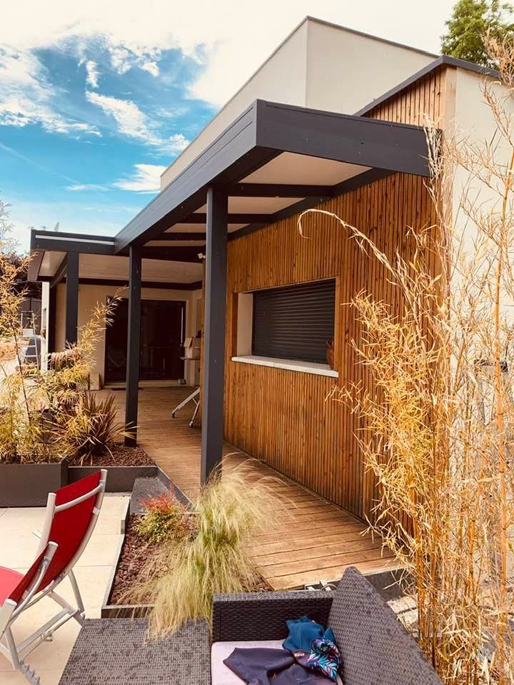 Un beau jardin terrasse coloré par la toute nouvelle pergola bioclimatique et ses deux stores zip orangés 🌞