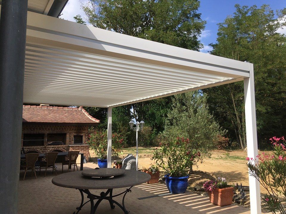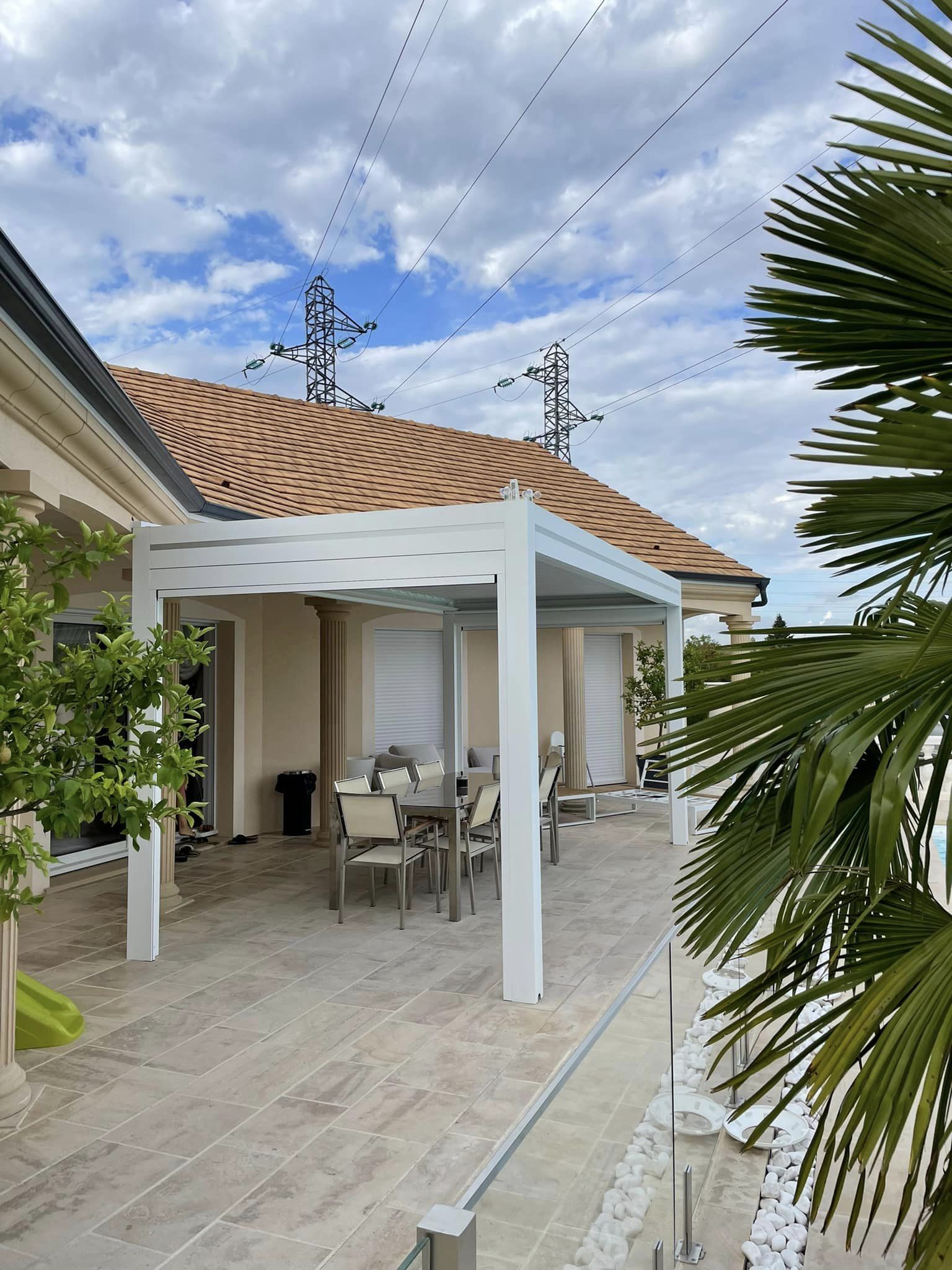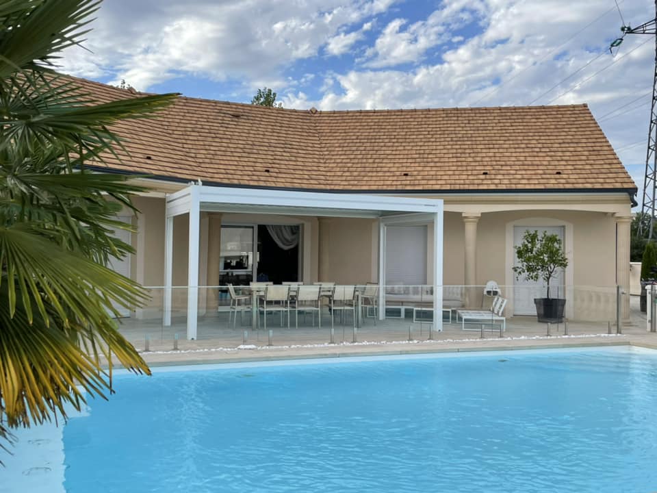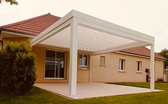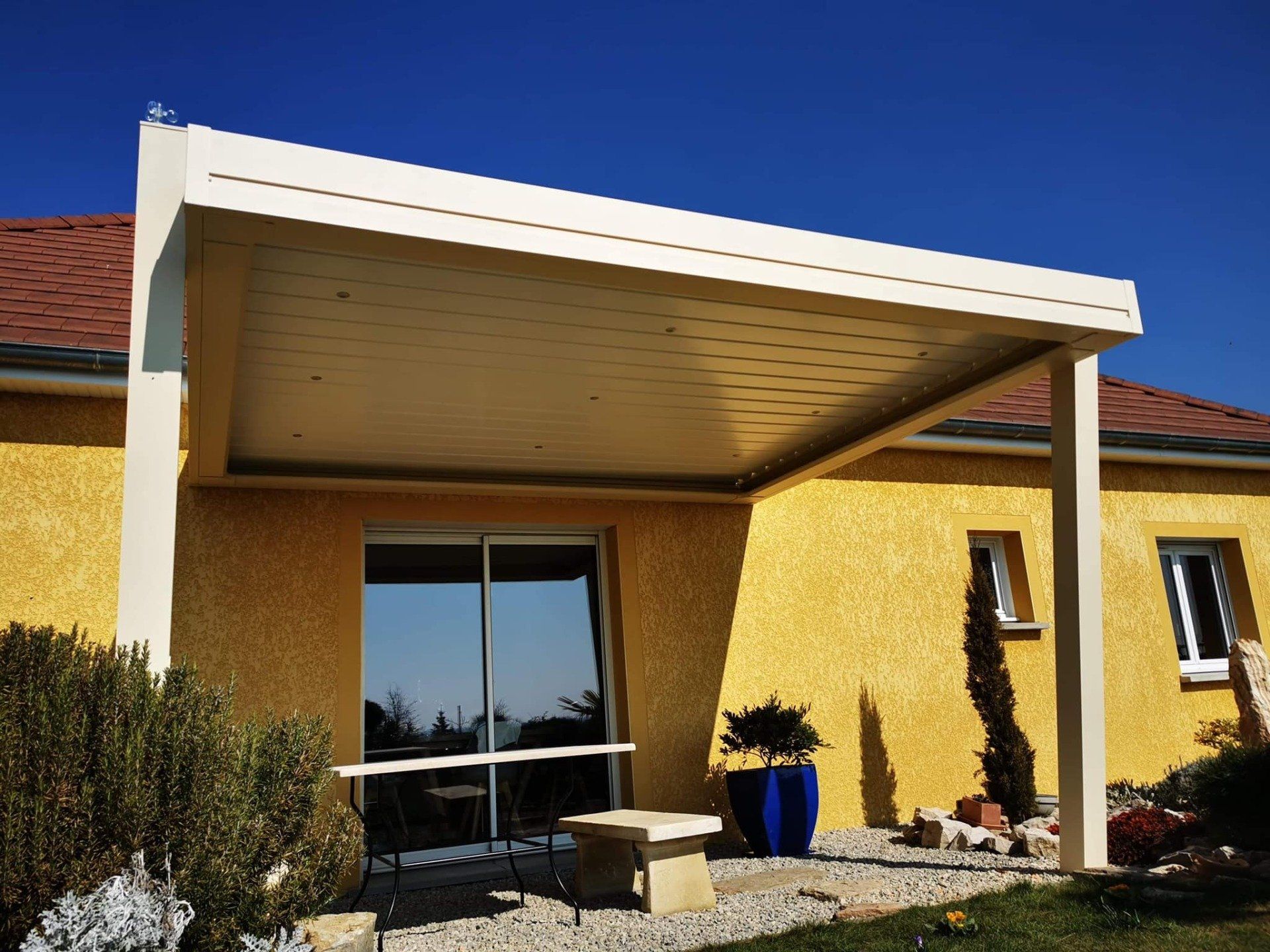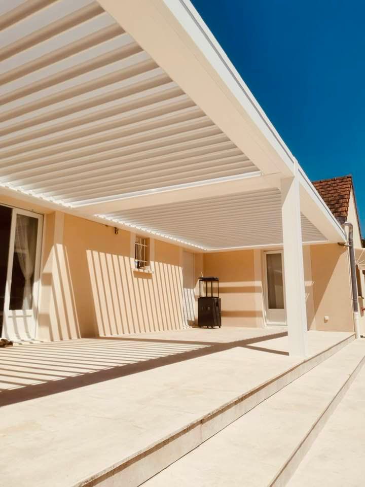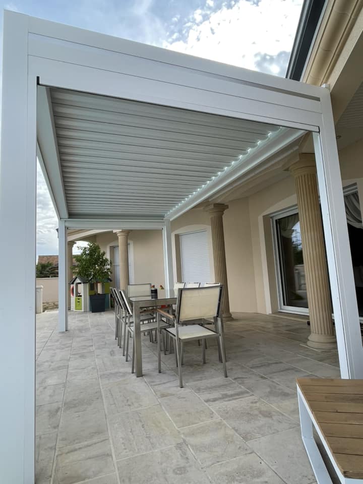 À Ouroux sur Saône (71), bel autre modèle de pergola bioclimatique Art Home Ventury. Du 100 % sur mesure pour couvrir cette belle terrasse en travertin.