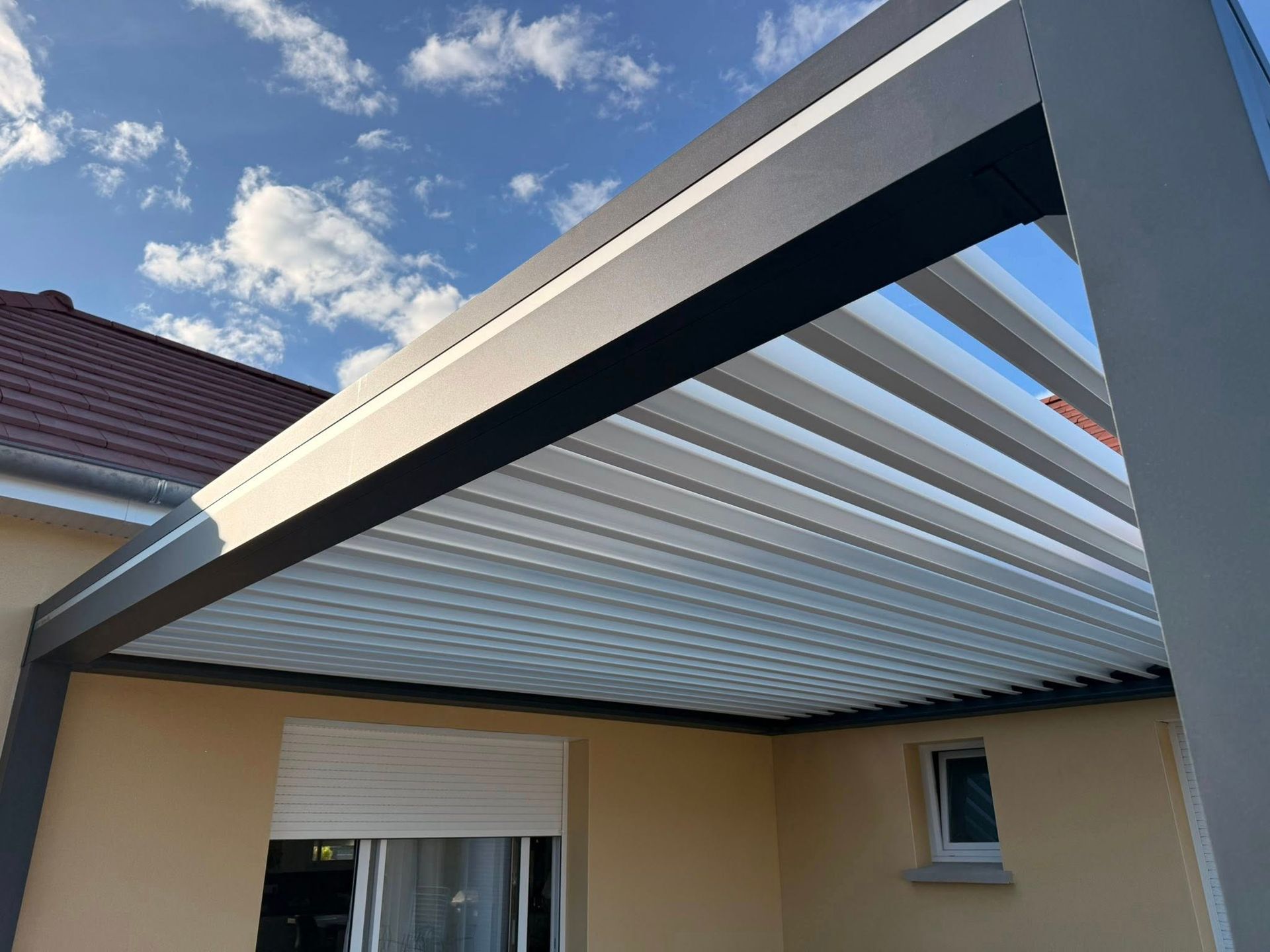 À La Chapelle Saint Sauveur, en Bresse (71), notre équipe finalise cette belle installation en aluminium : une pergola bioclimatique Art Home Alu, réalisée sur mesure.