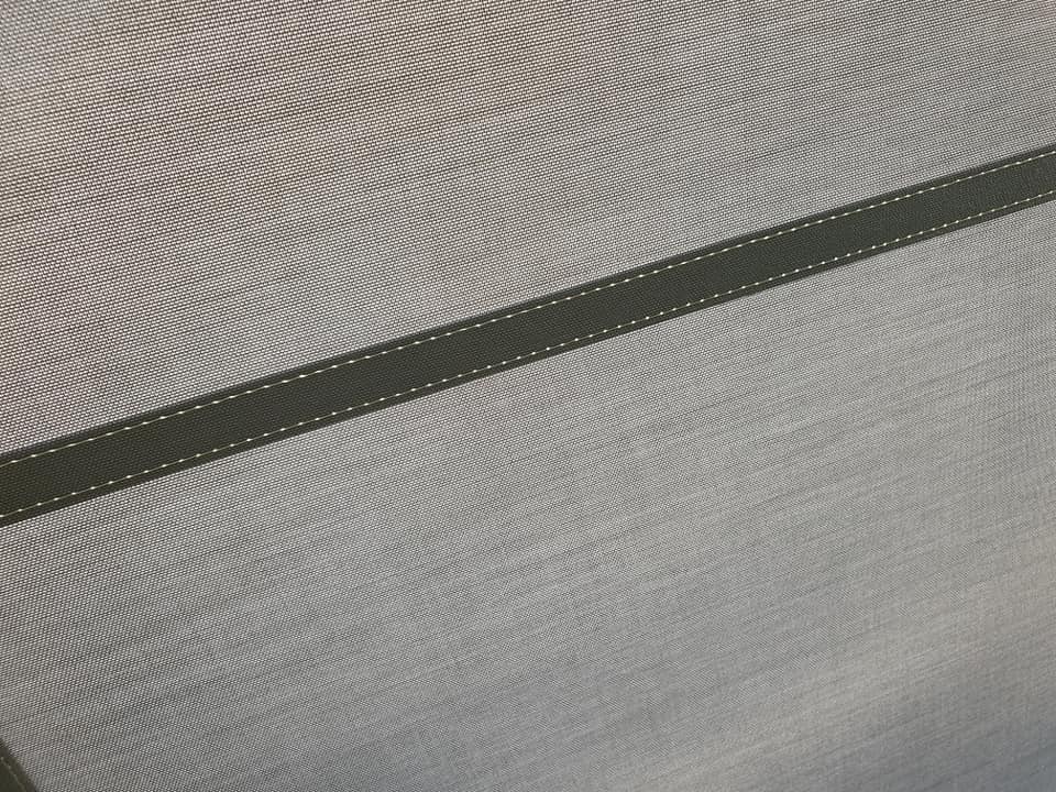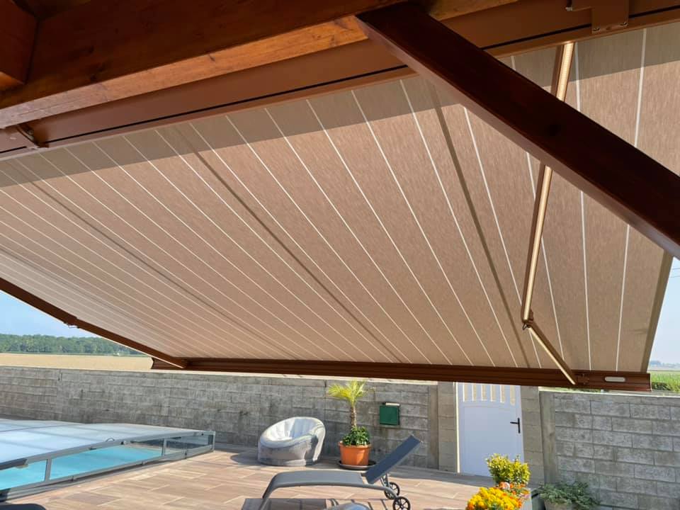 👉 Teinte de la toile sur mesure, au choix du client et teinte des bras et coffres sur mesure également, ici identique aux poutres existantes 🤩