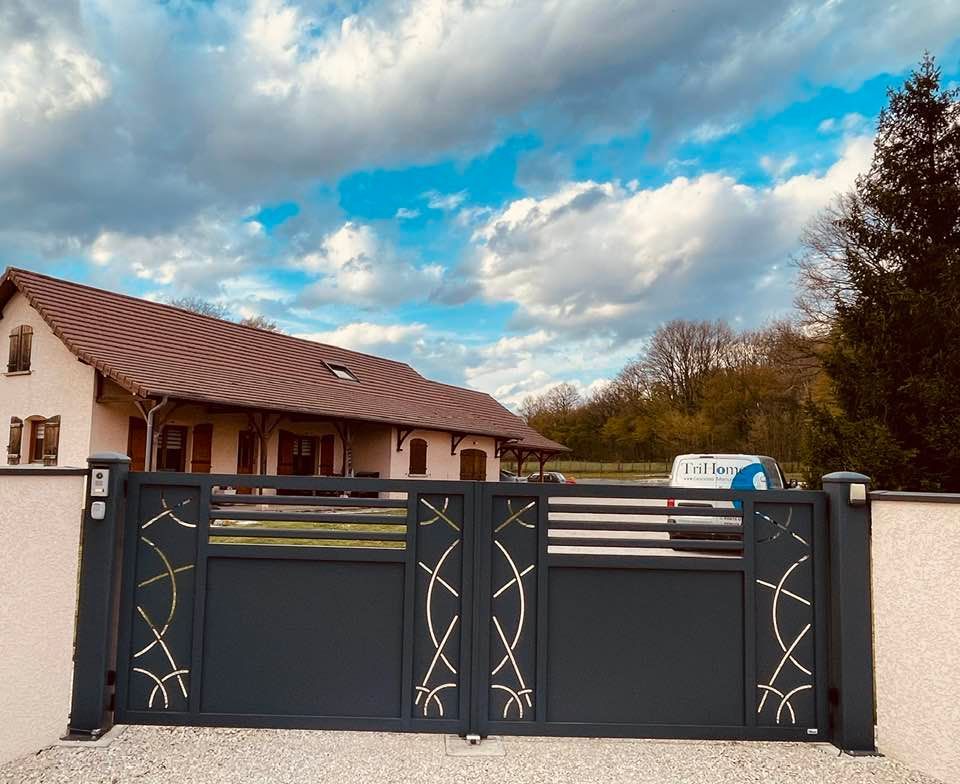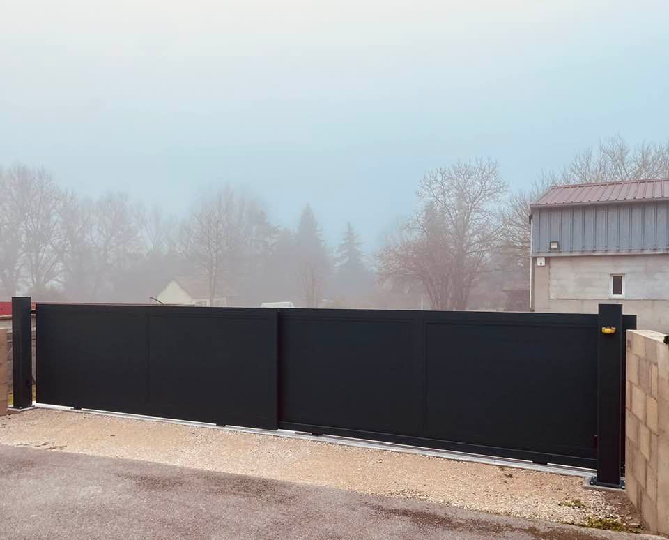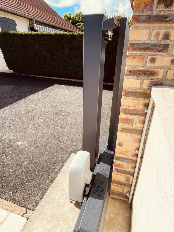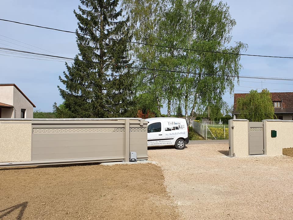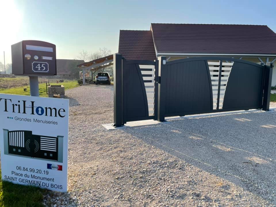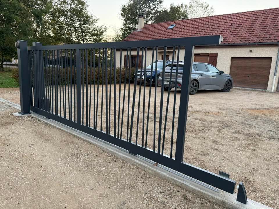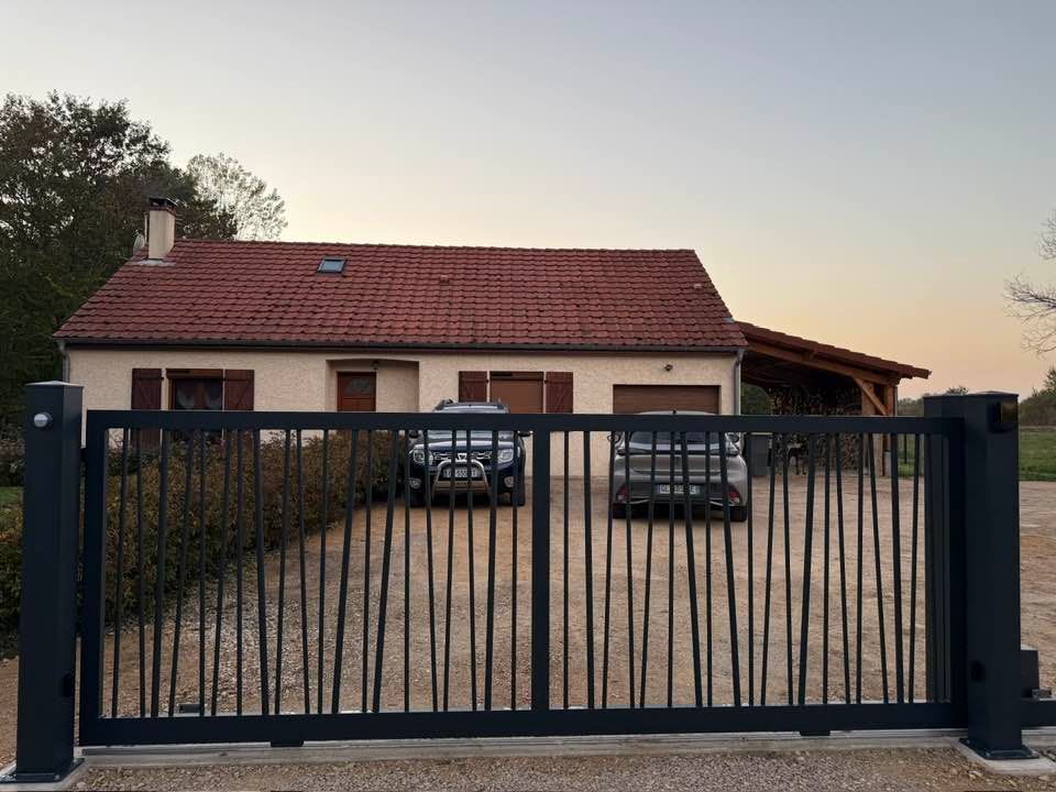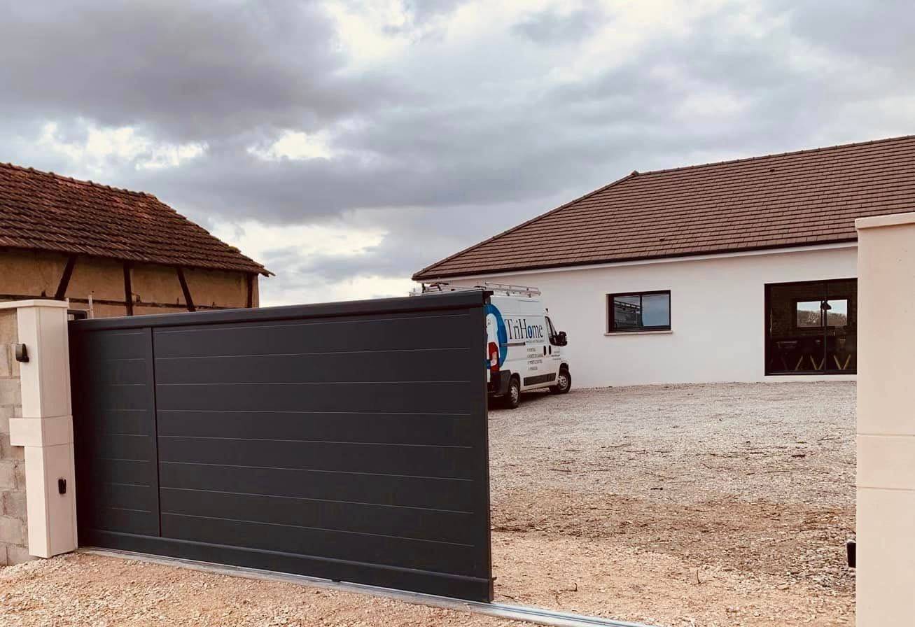À Branges (71), juste avant la pause estivale de notre équipe Trihome, installation finalisée de ce portail sur mesure aluminum soudé et motorisé