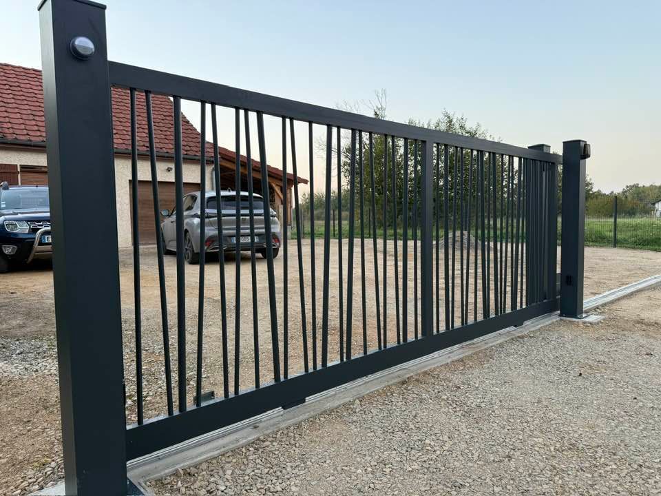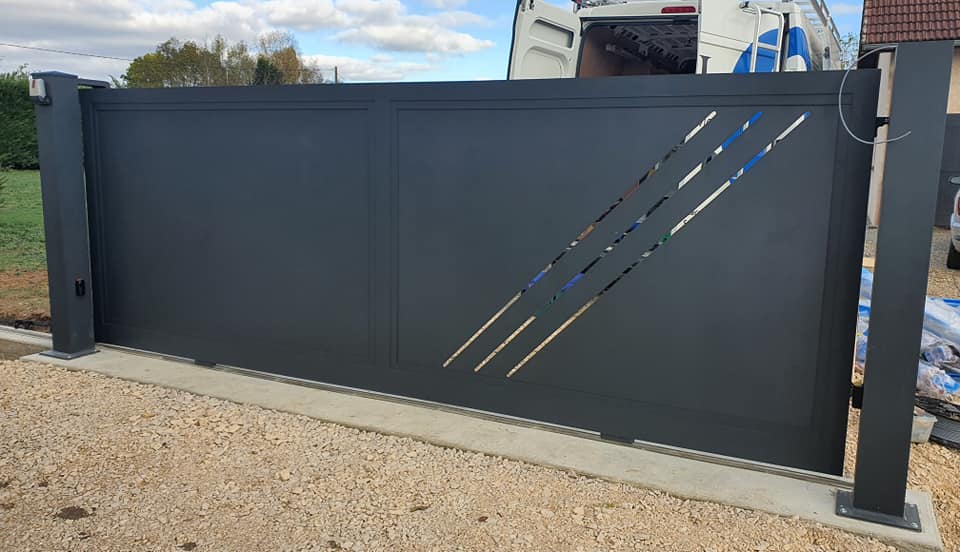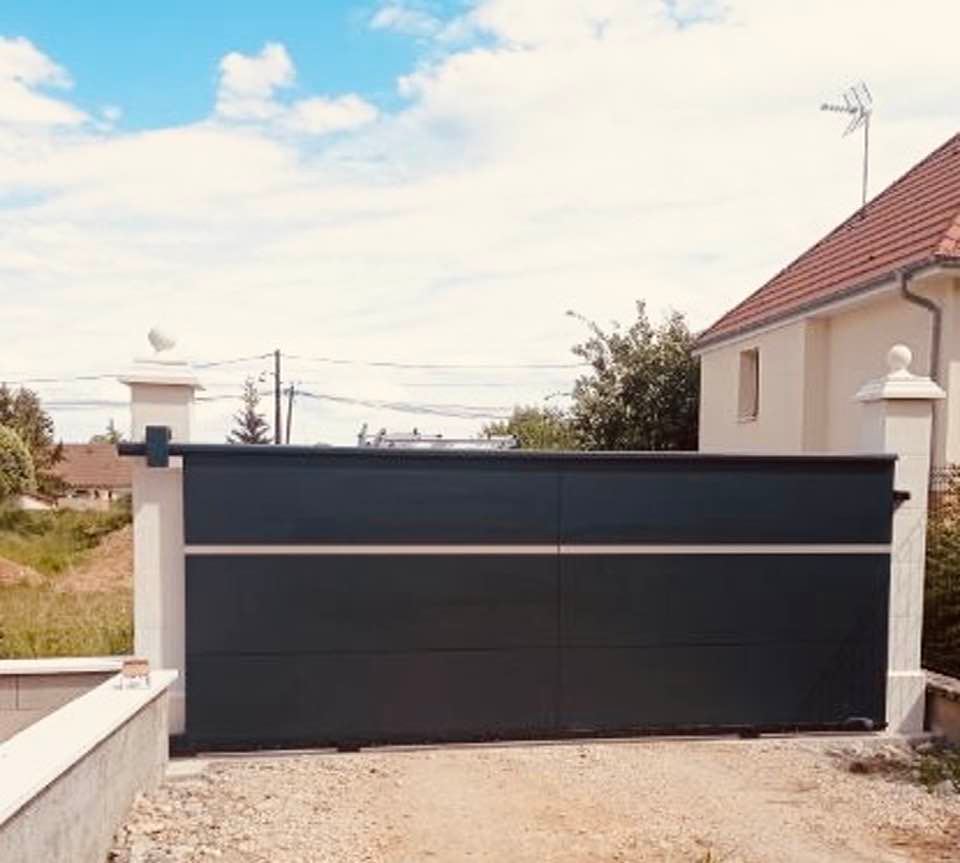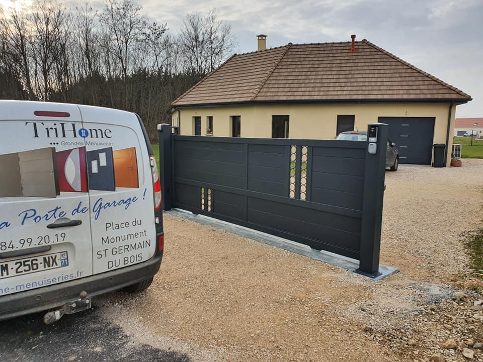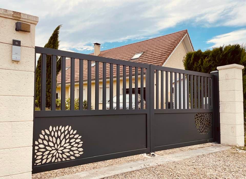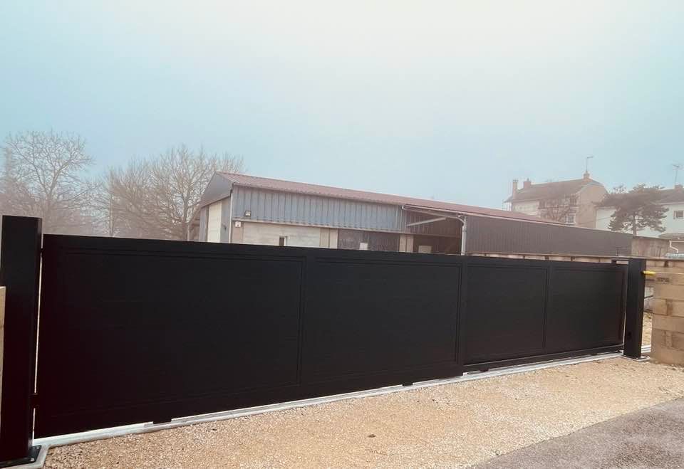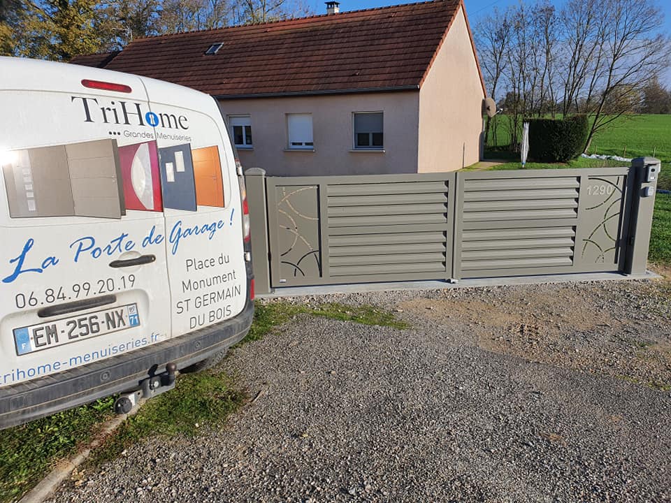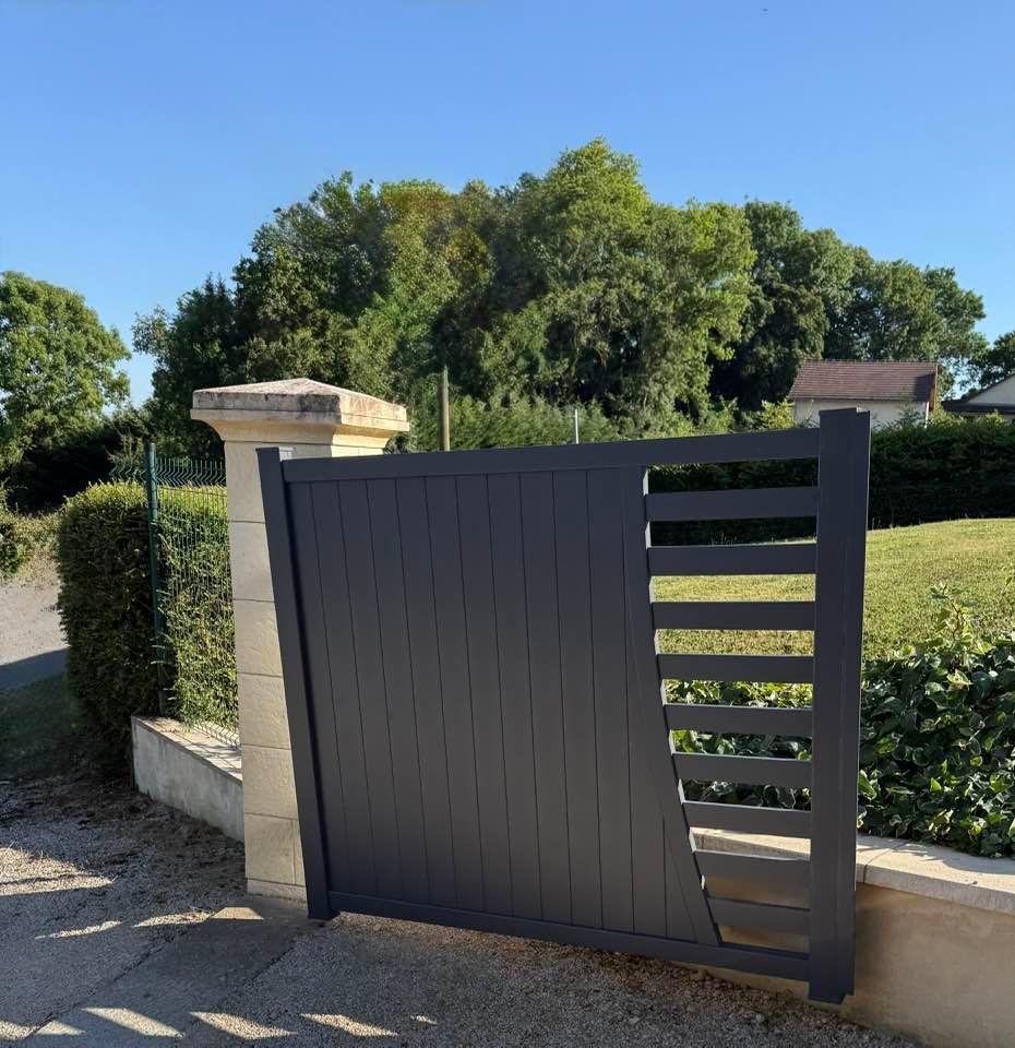 À Branges (71), juste avant la pause estivale de notre équipe Trihome, installation finalisée de ce portail sur mesure aluminum soudé et motorisé