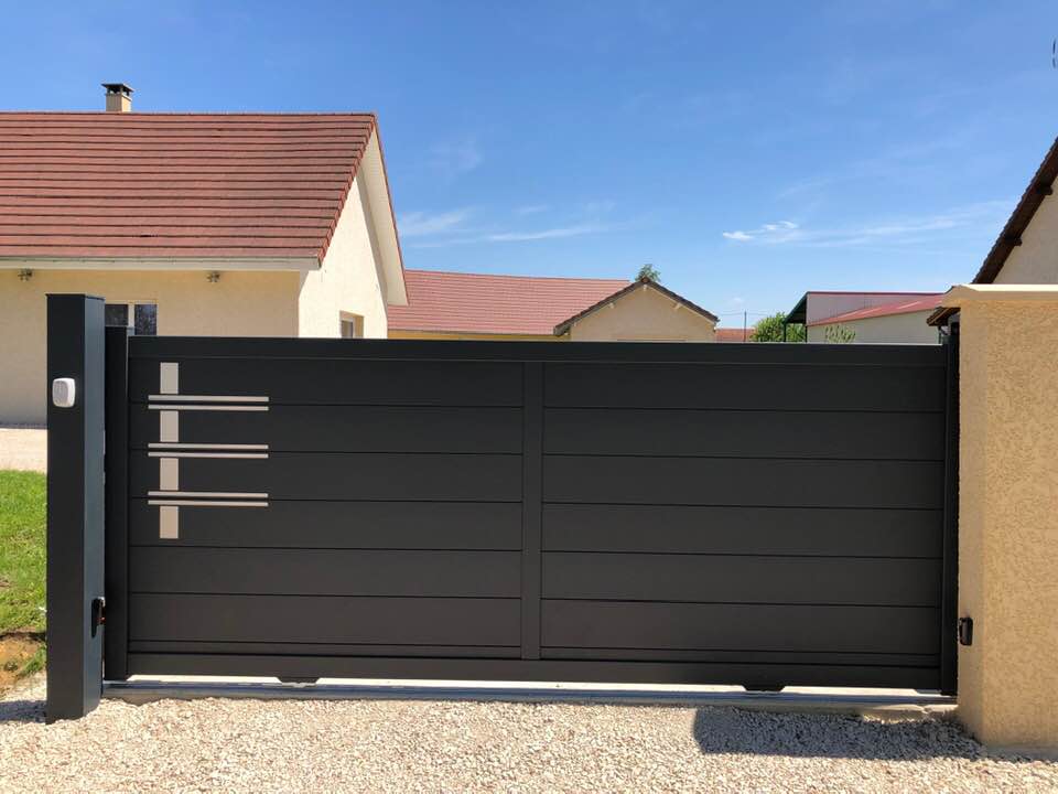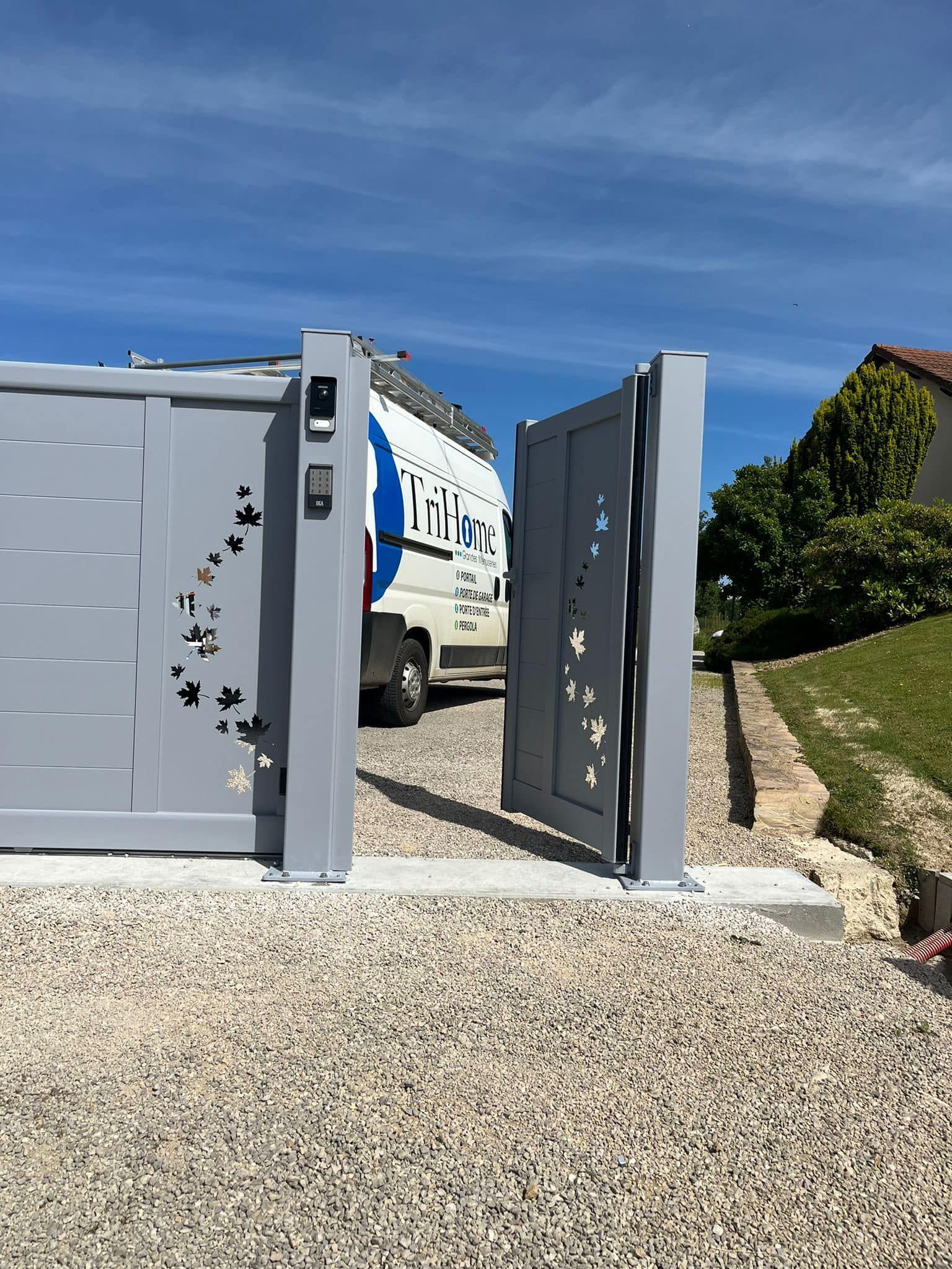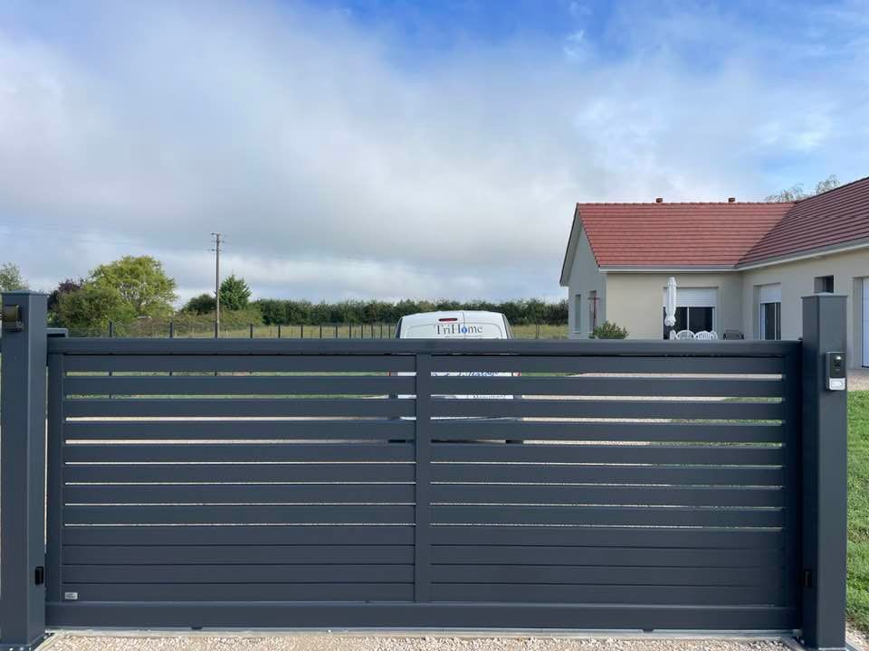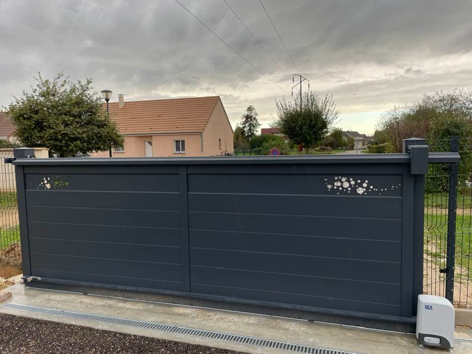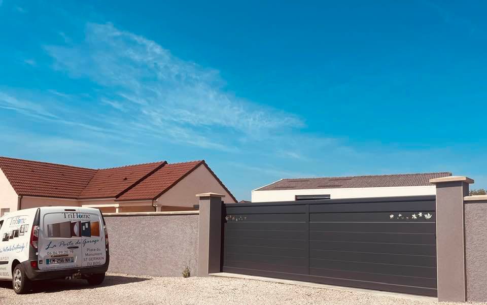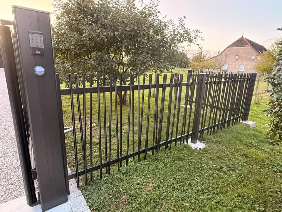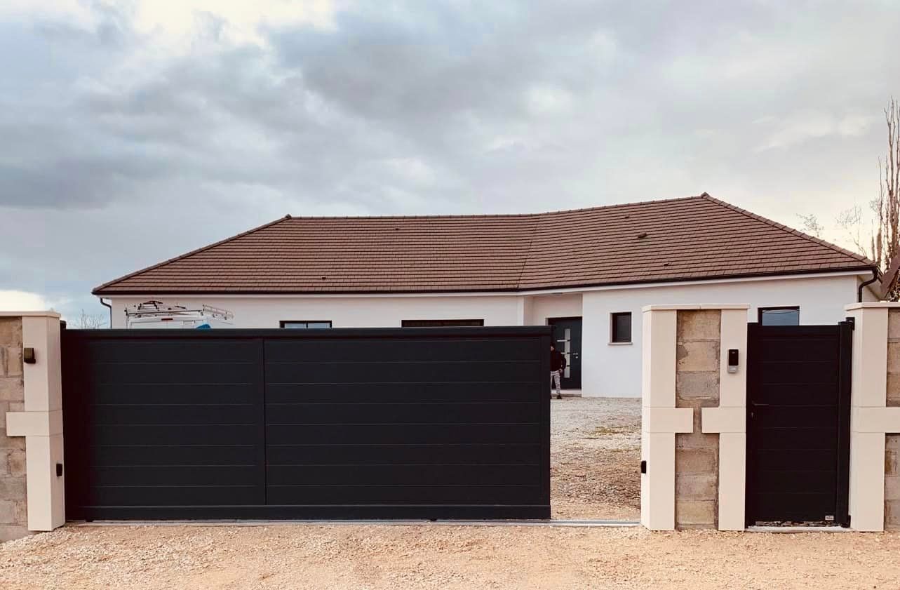 À Branges (71), juste avant la pause estivale de notre équipe Trihome, installation finalisée de ce portail sur mesure aluminum soudé et motorisé