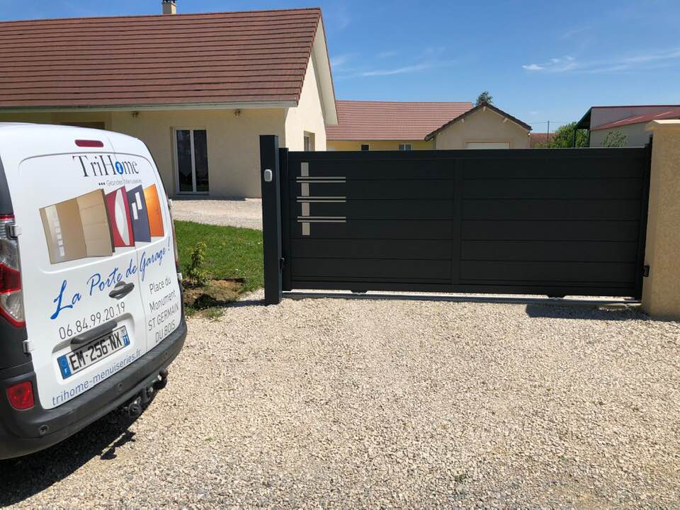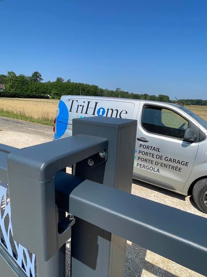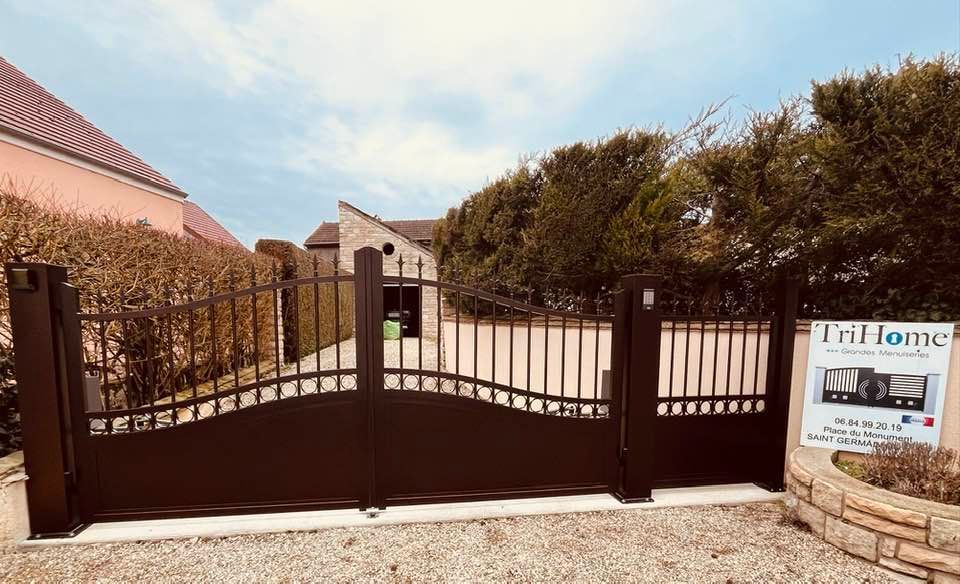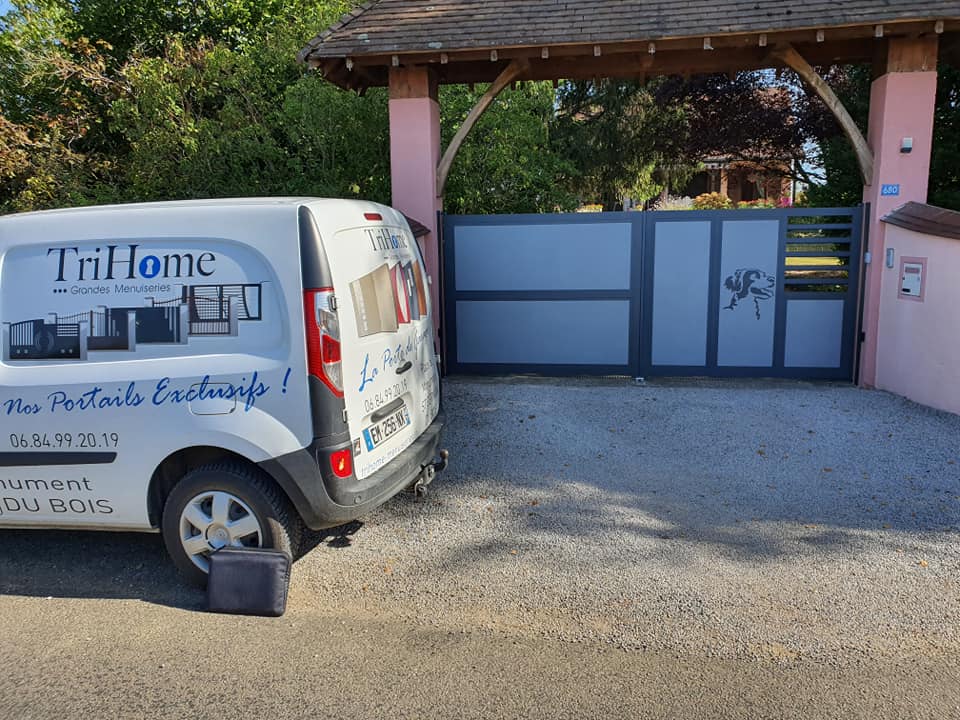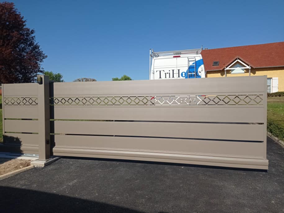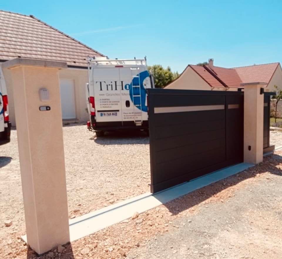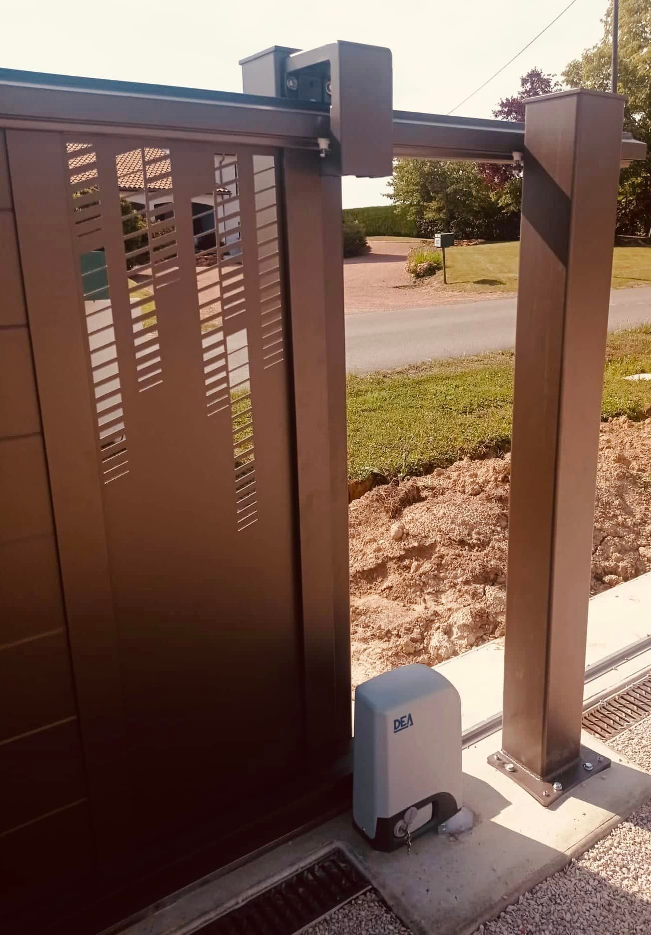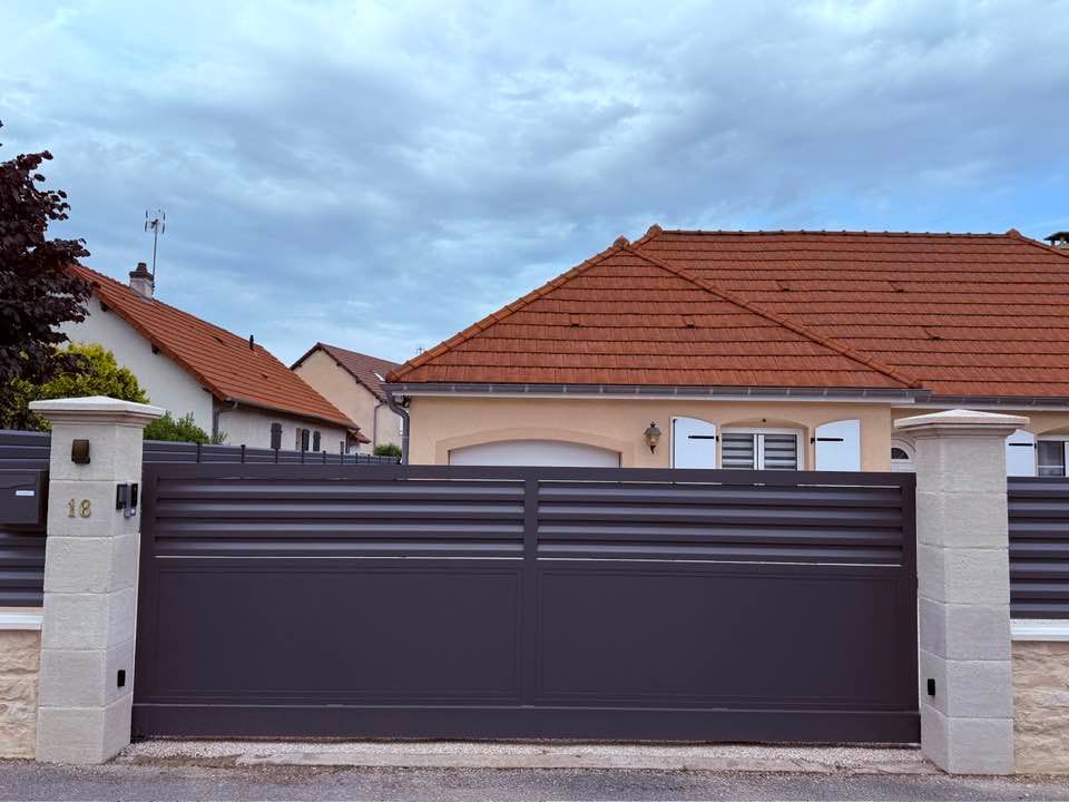 À Branges (71), juste avant la pause estivale de notre équipe Trihome, installation finalisée de ce portail sur mesure aluminum soudé et motorisé