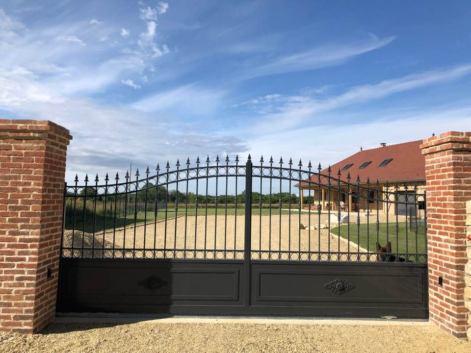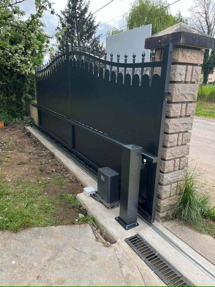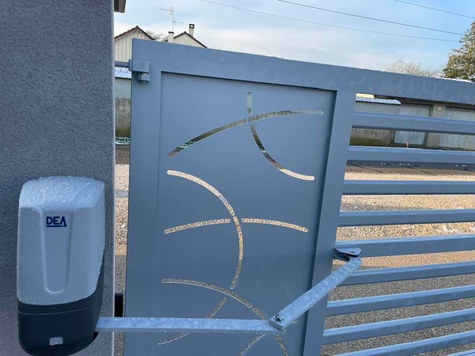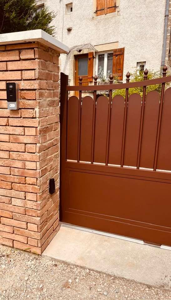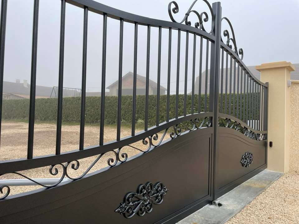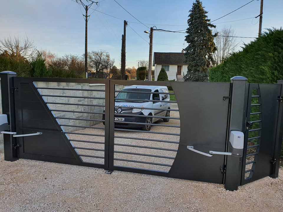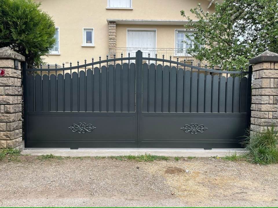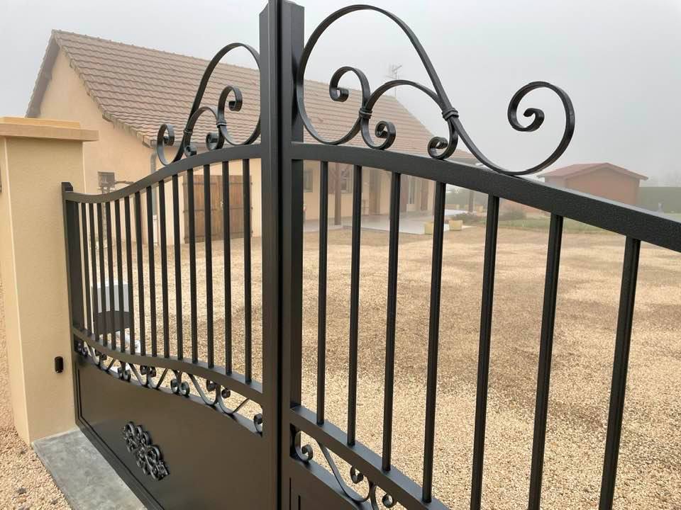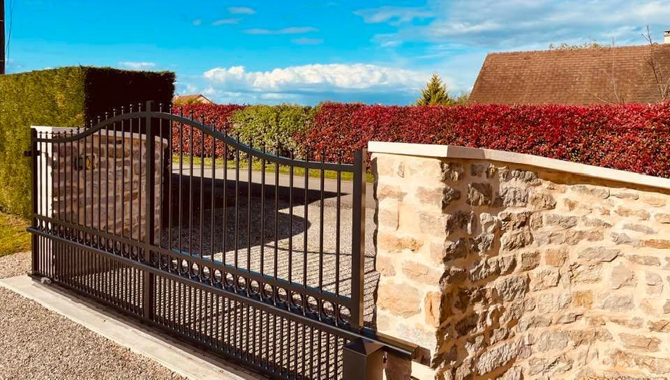 À Bruailles (71), installation et pose de ce joli portail aluminium soudé deux battants motorisés dans un style traditionnel mais très fonctionnel !