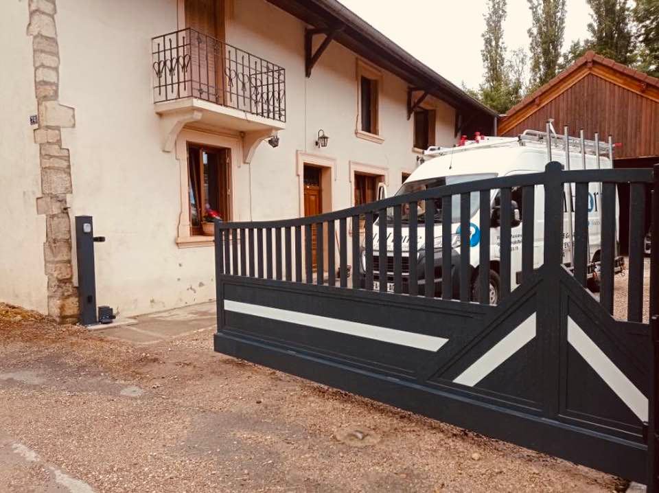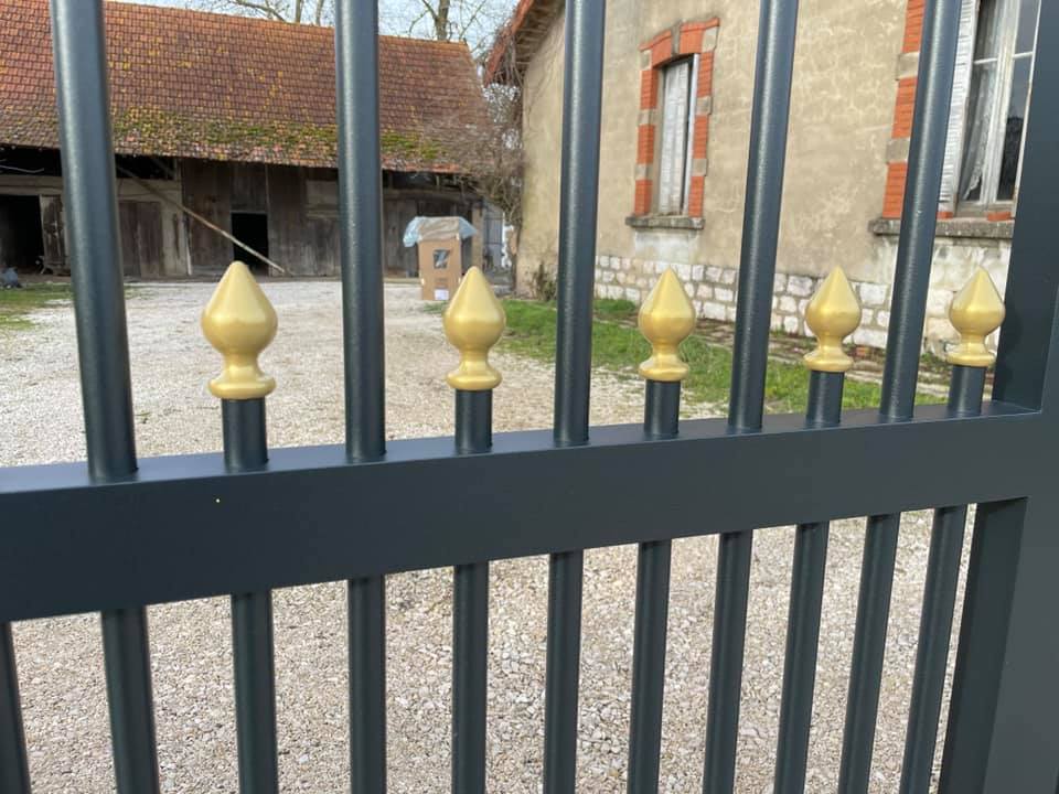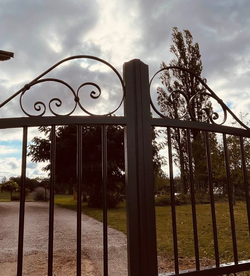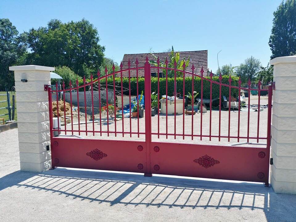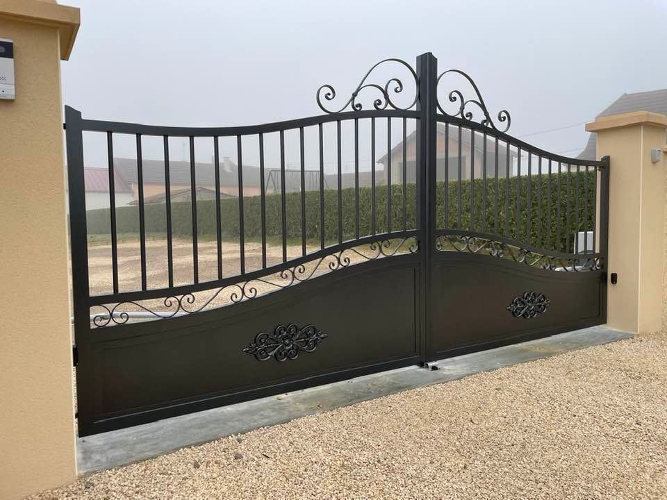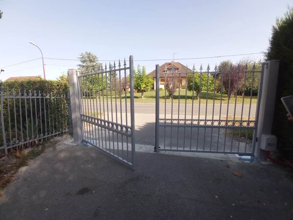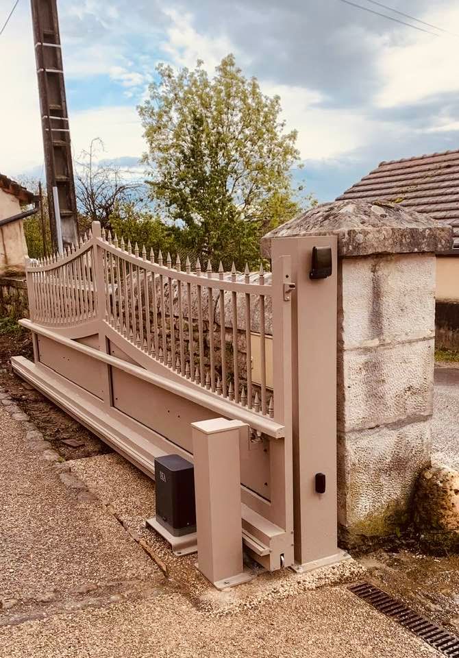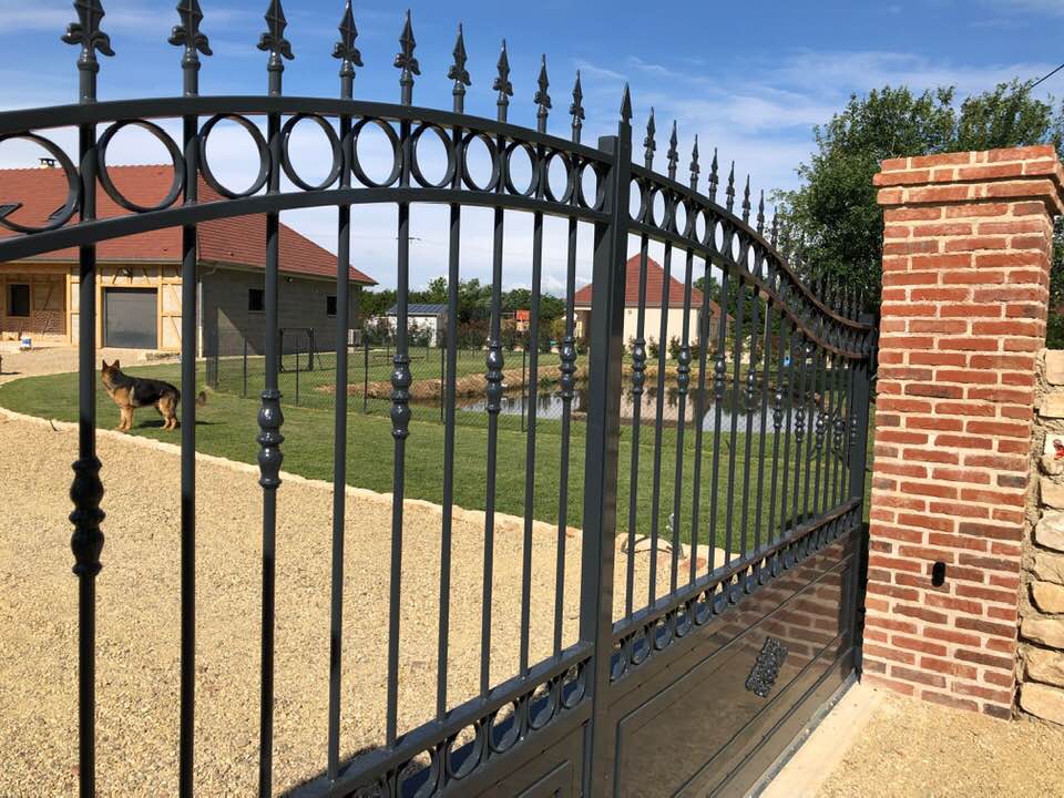 À Bruailles (71), installation et pose de ce joli portail aluminium soudé deux battants motorisés dans un style traditionnel mais très fonctionnel !