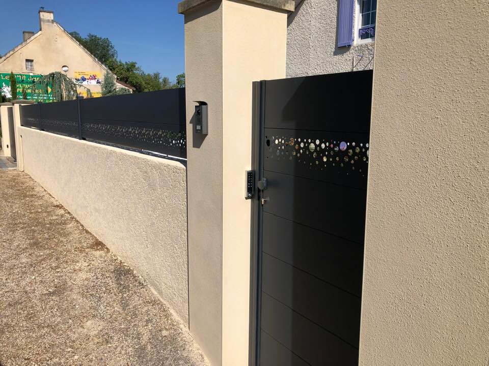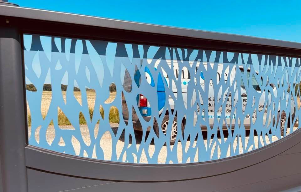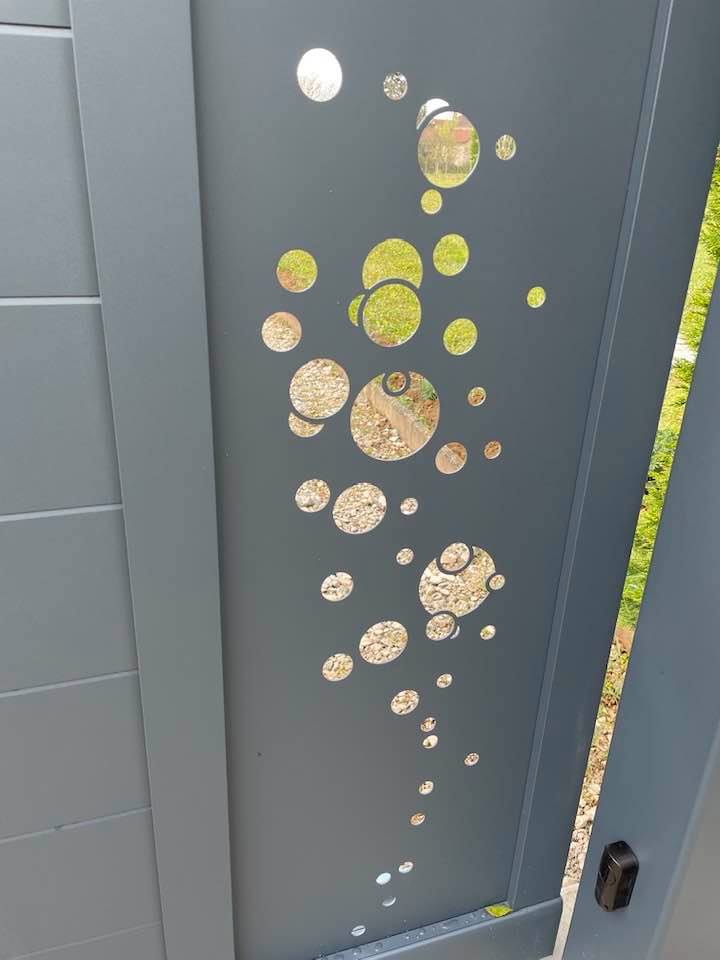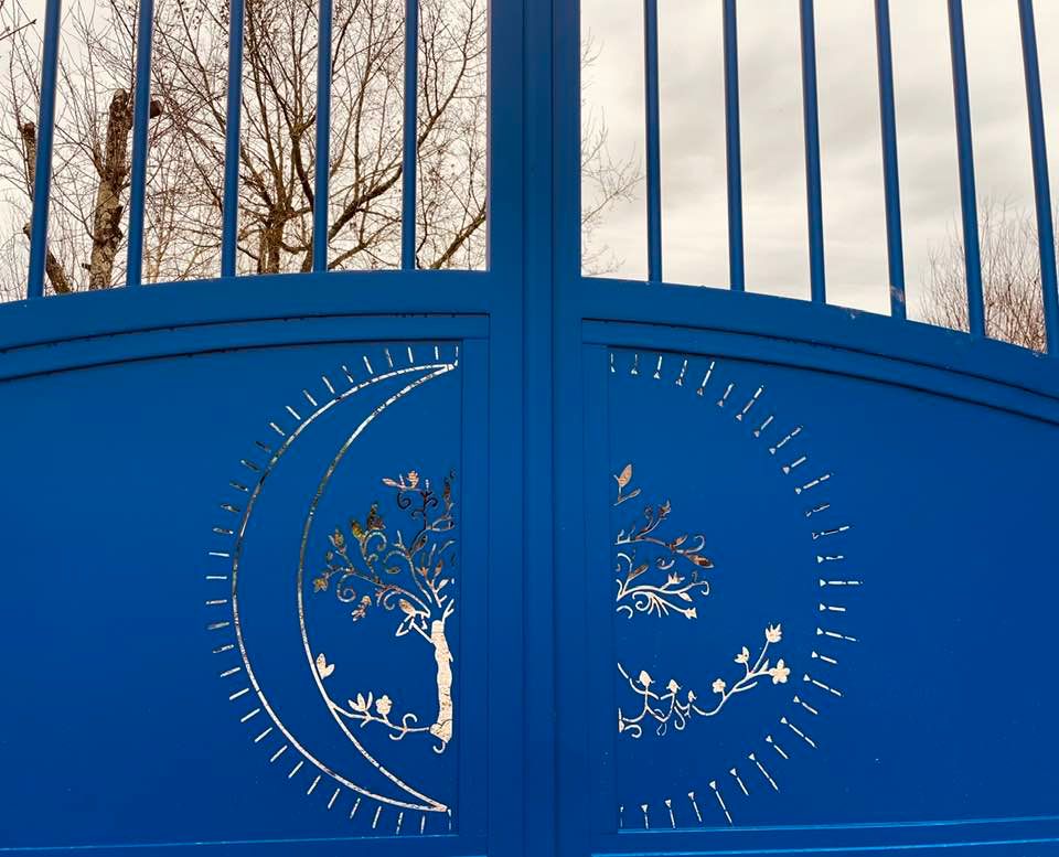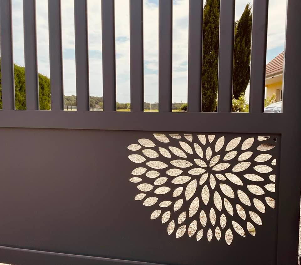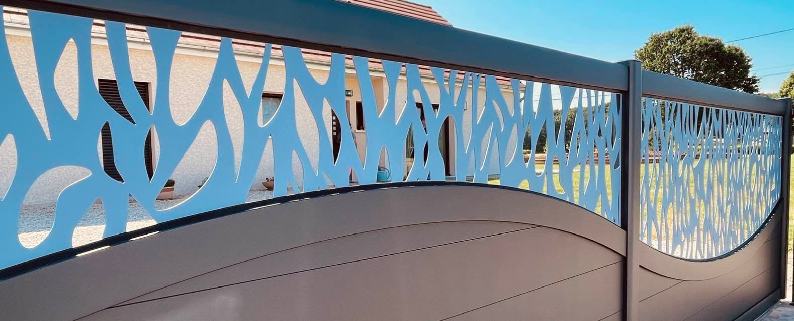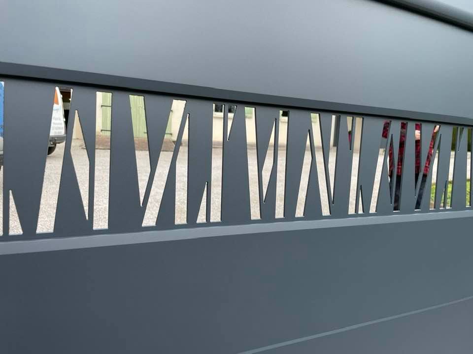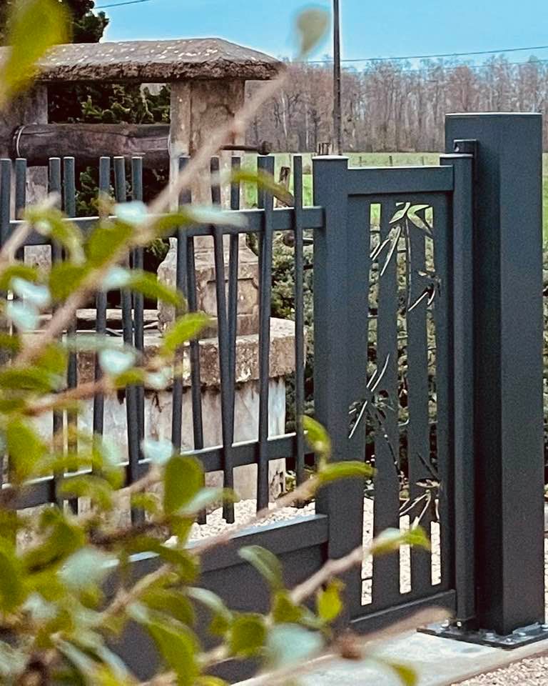 - clôture , portillon et portail avec motif personnalisé en découpe jet d’eau.