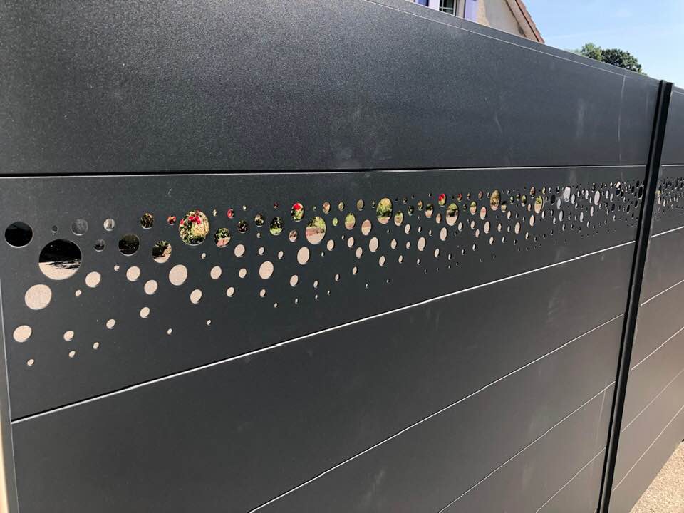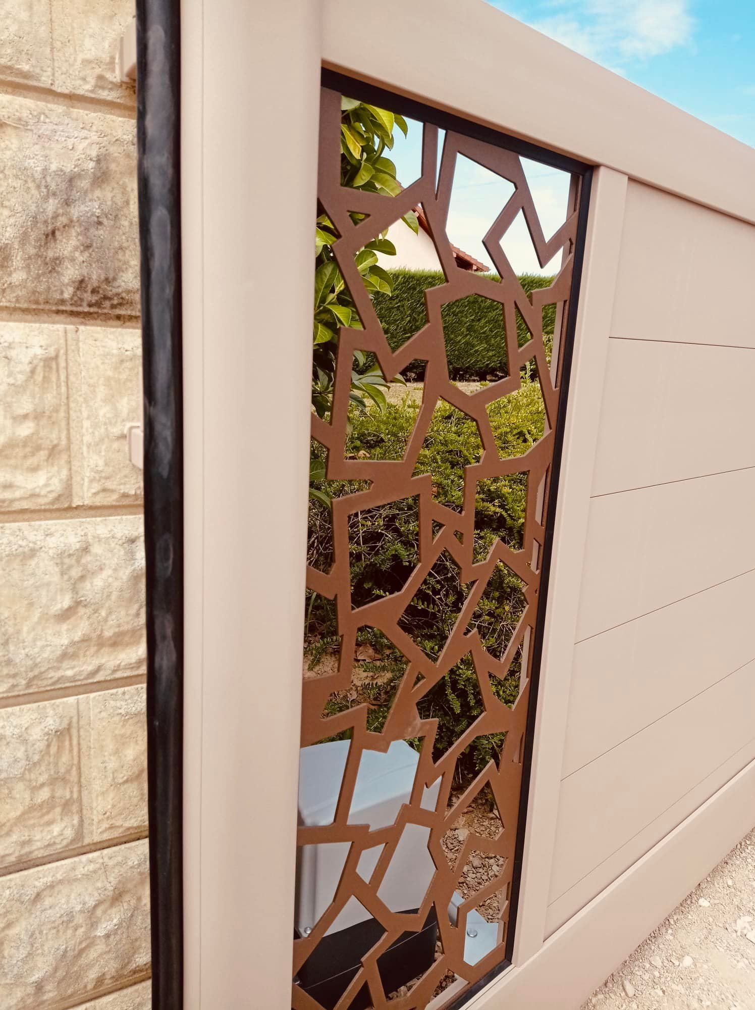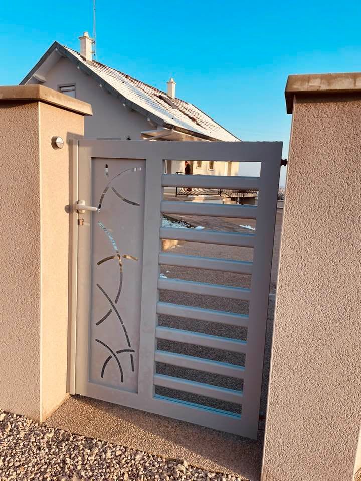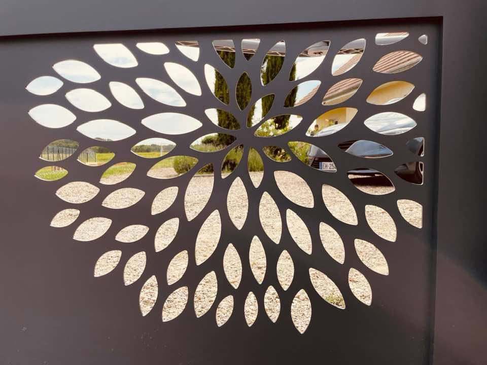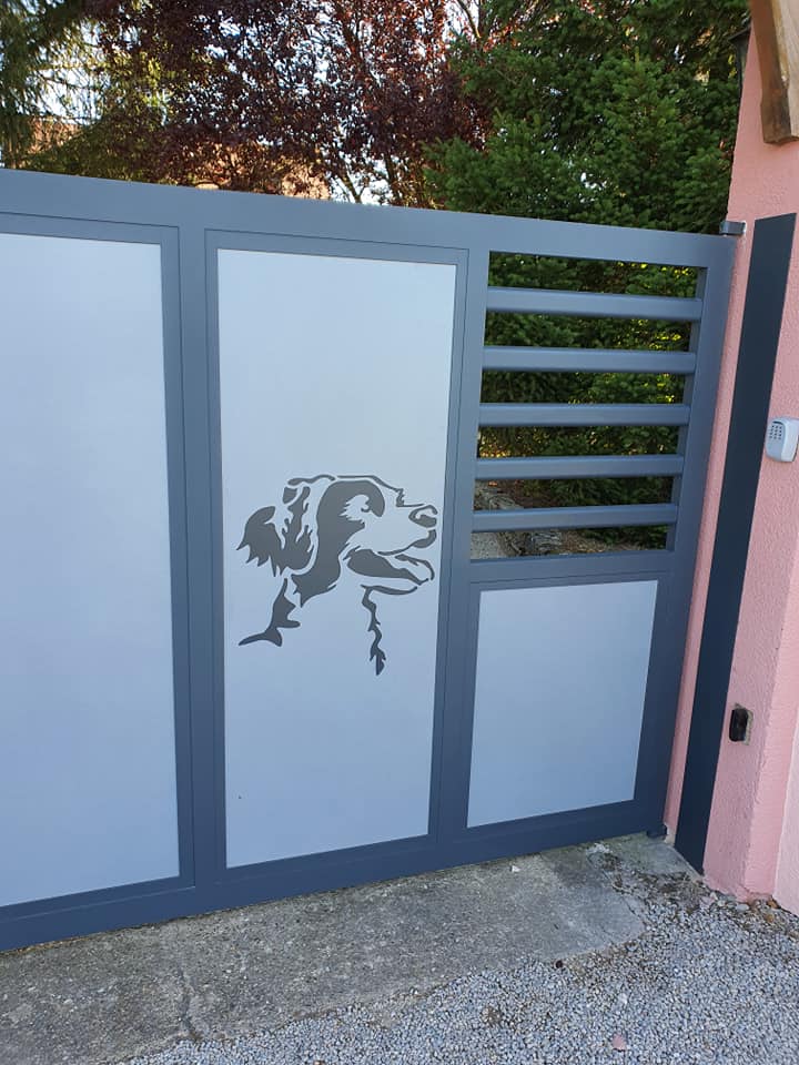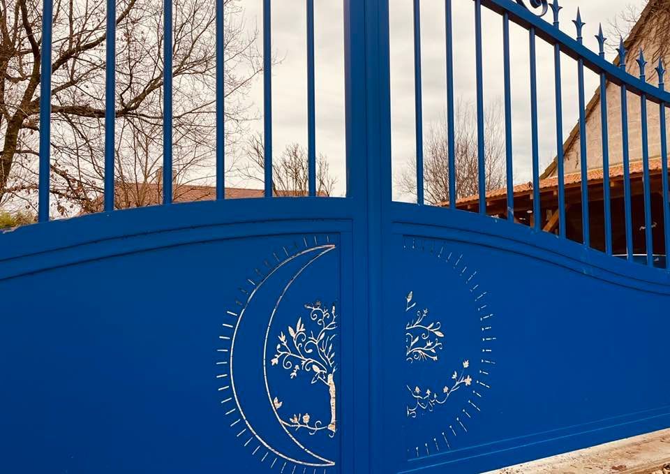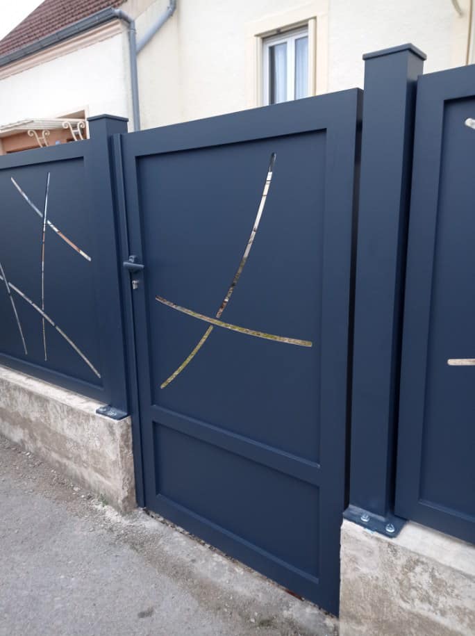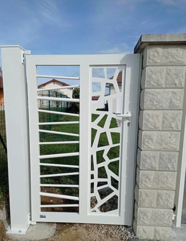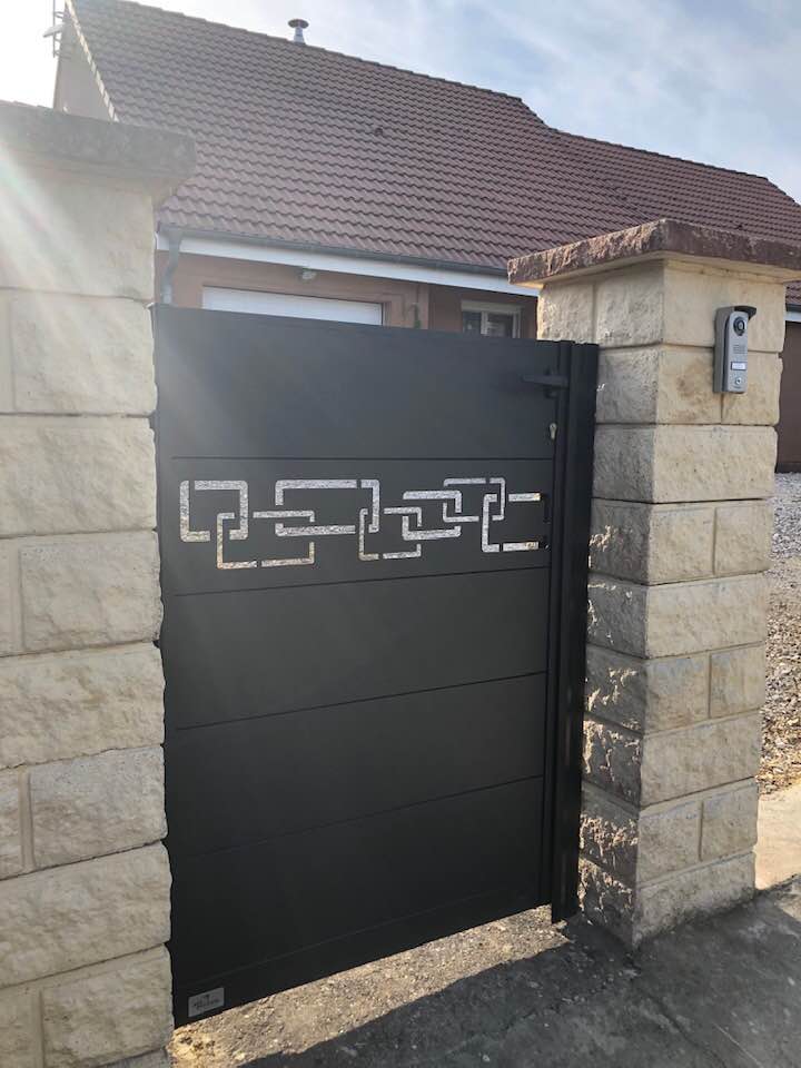 - clôture , portillon et portail avec motif personnalisé en découpe jet d’eau.