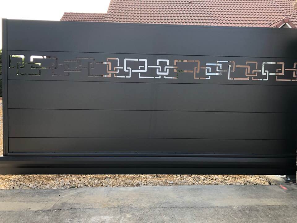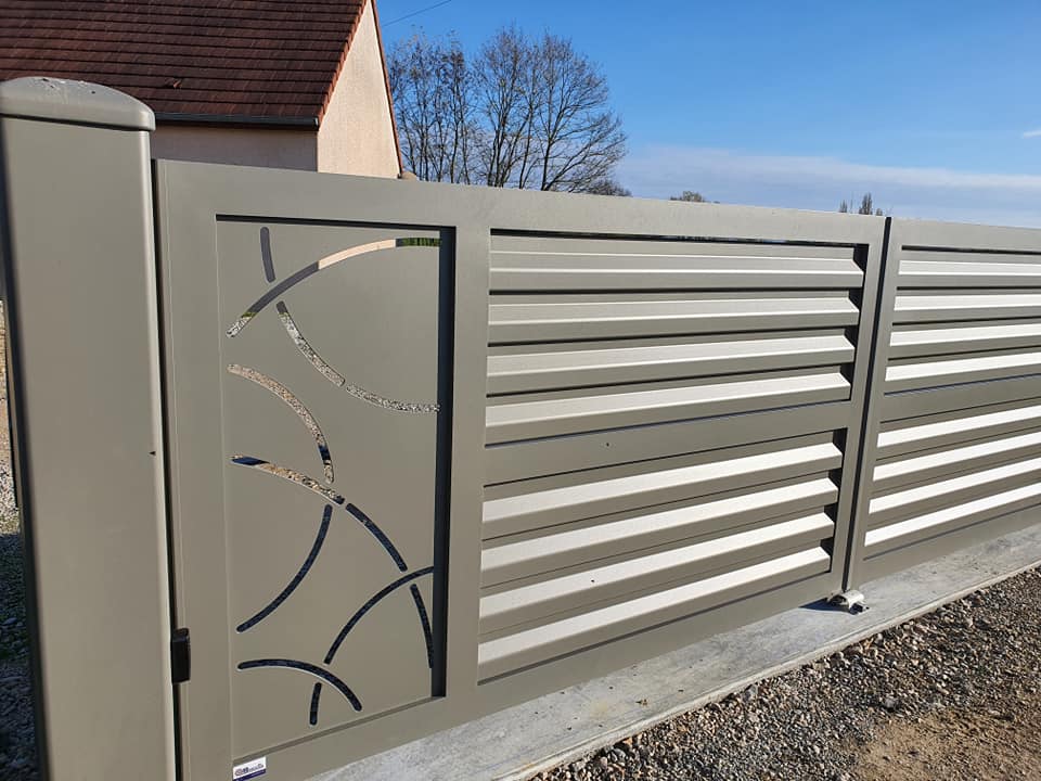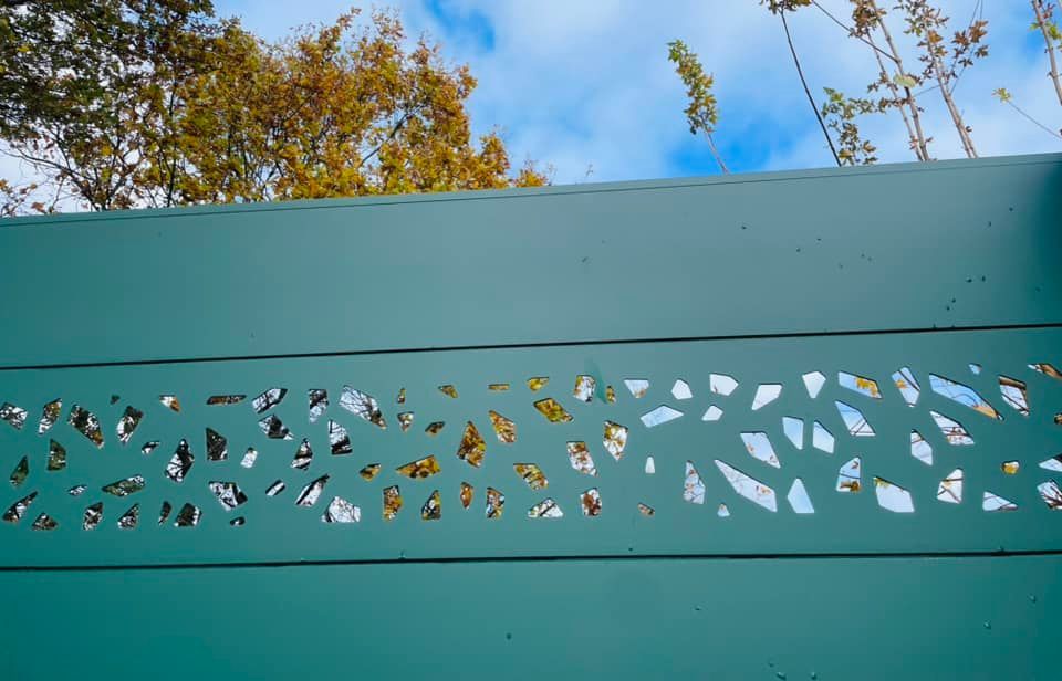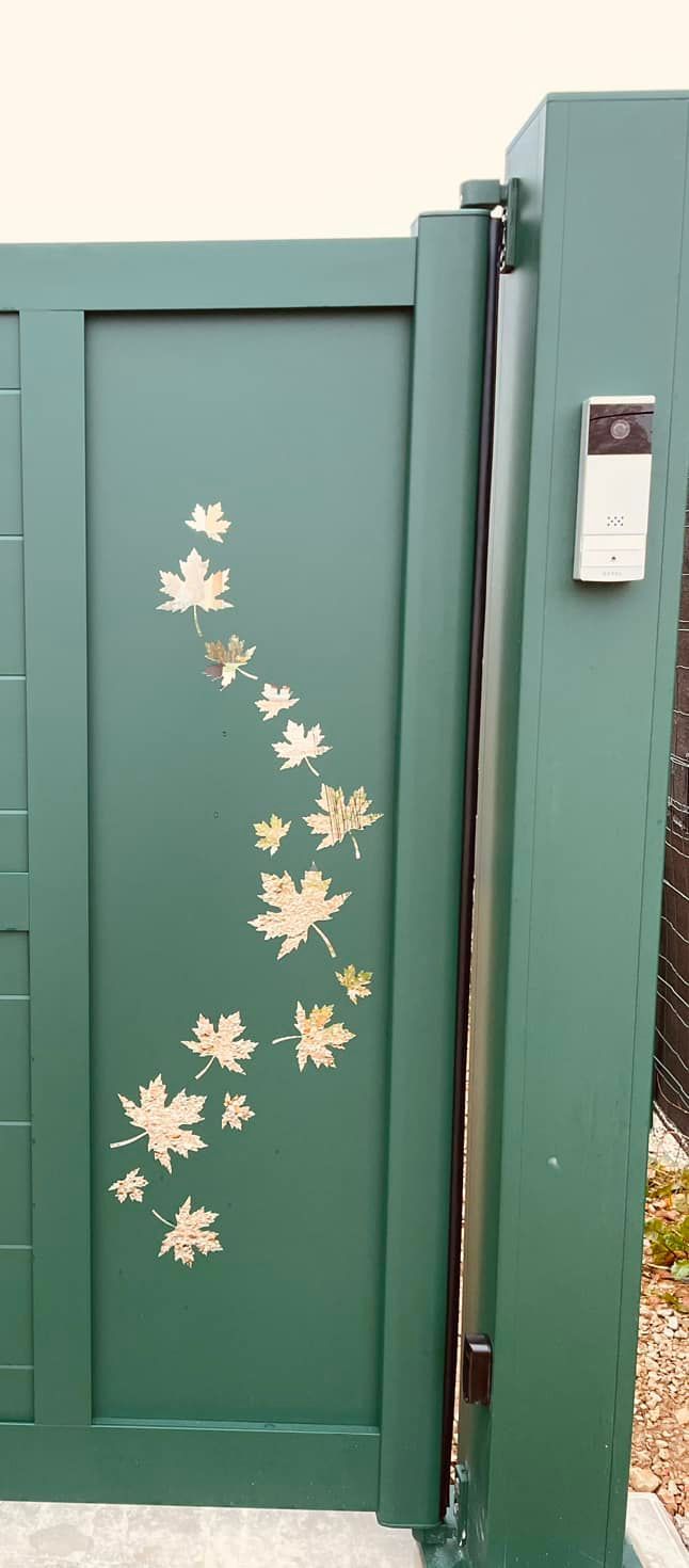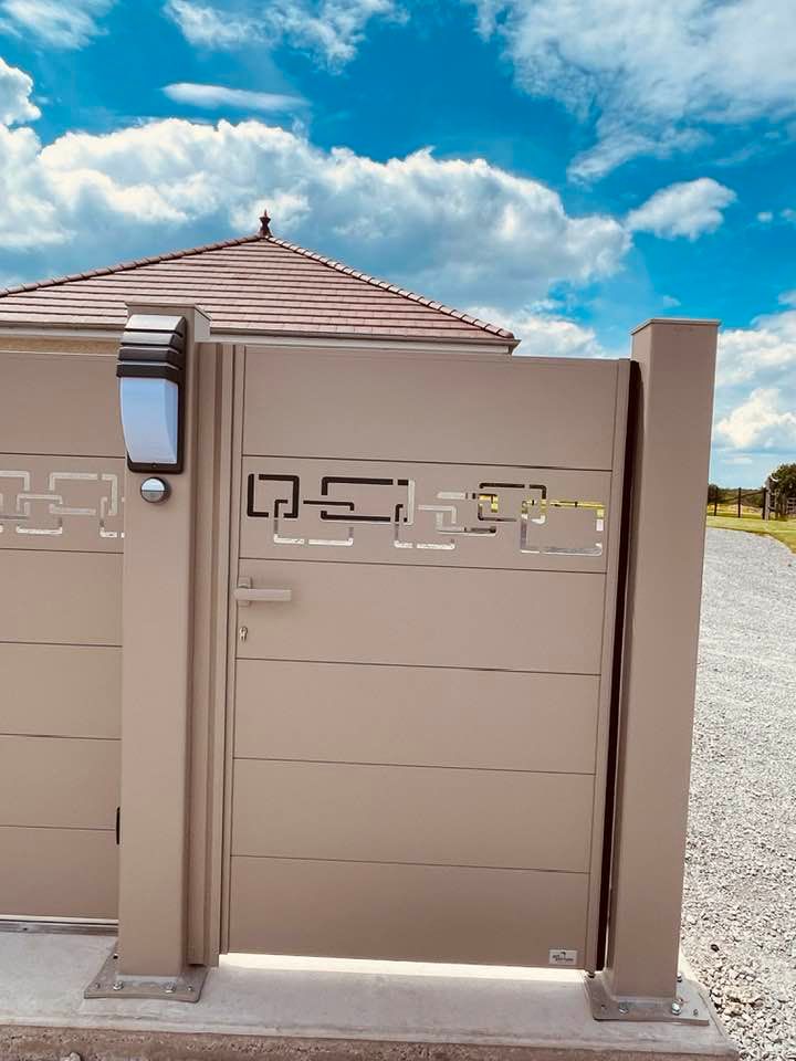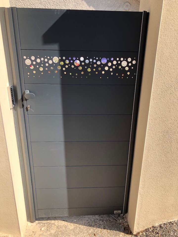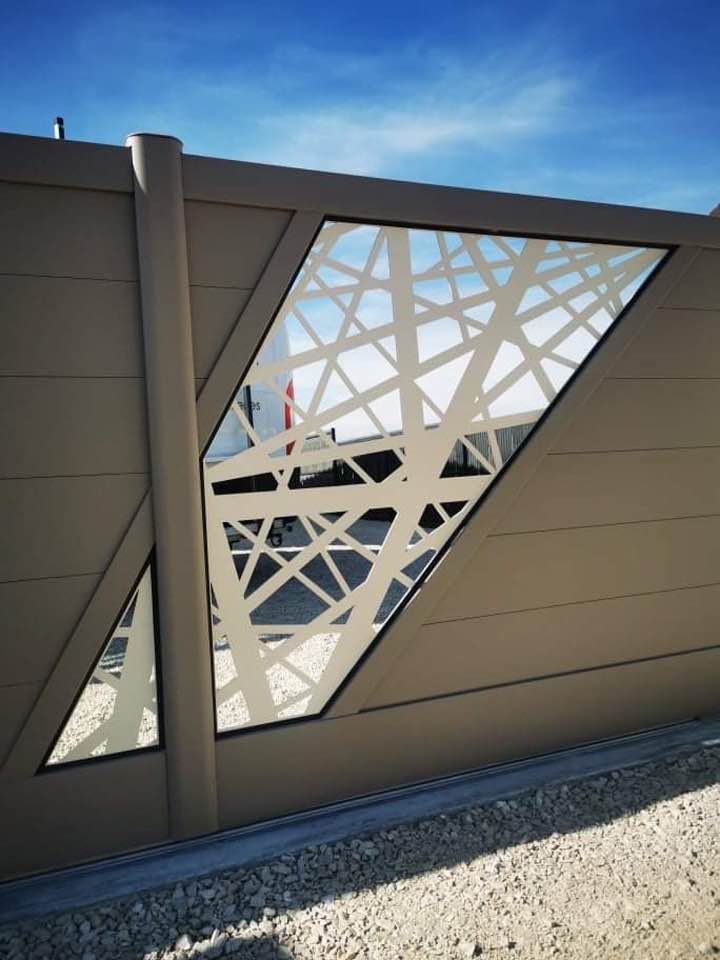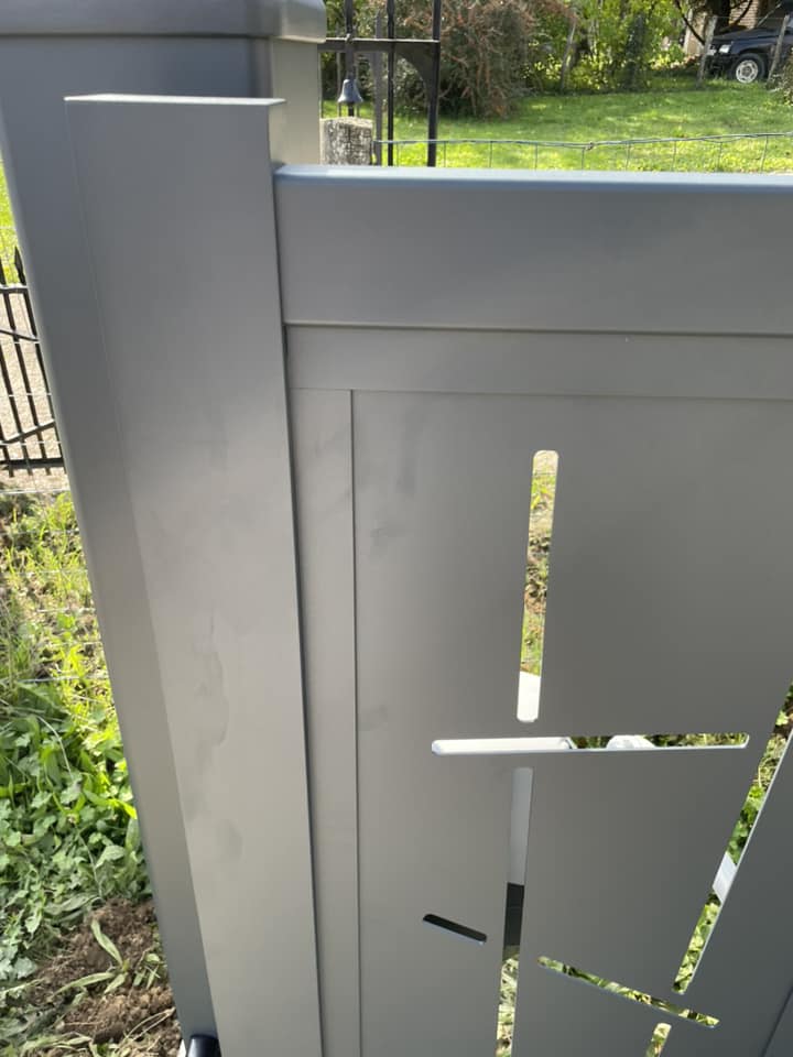 - clôture , portillon et portail avec motif personnalisé en découpe jet d’eau.