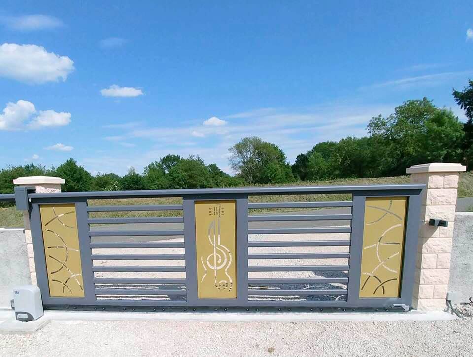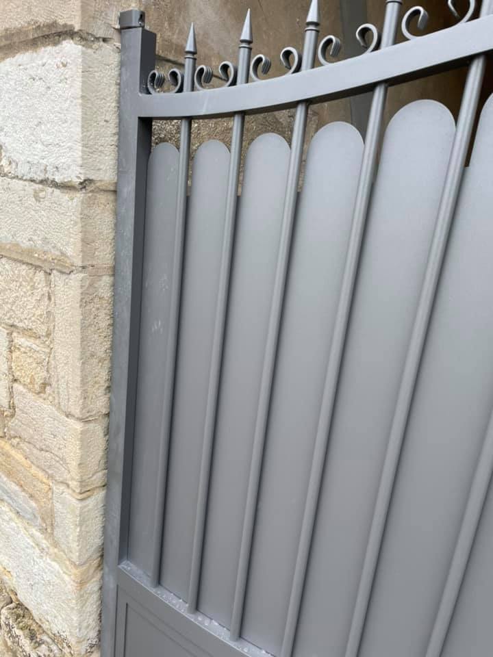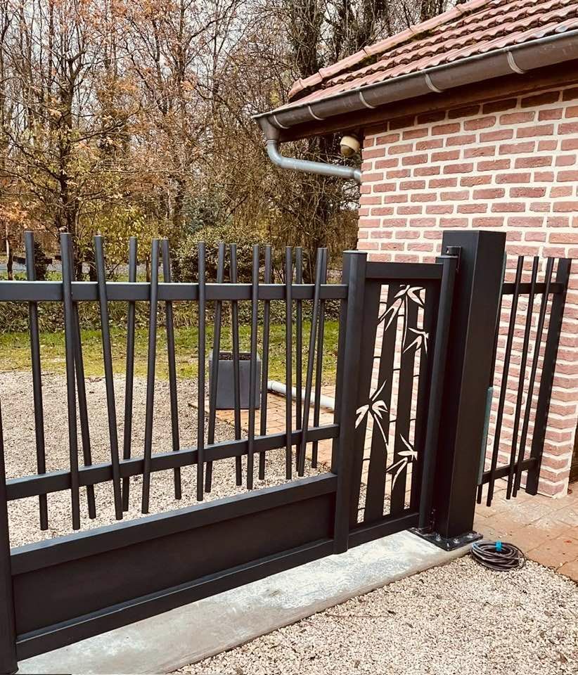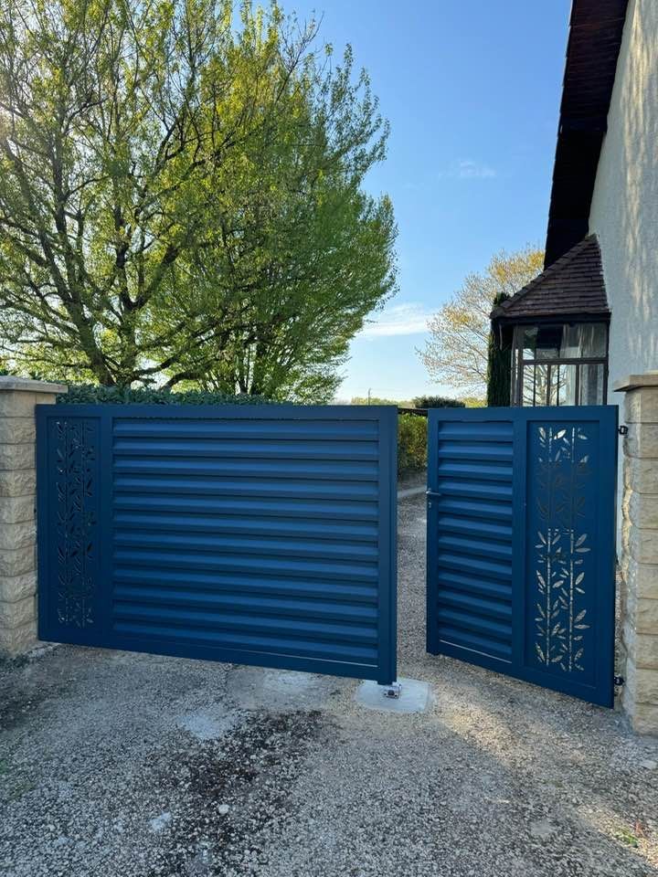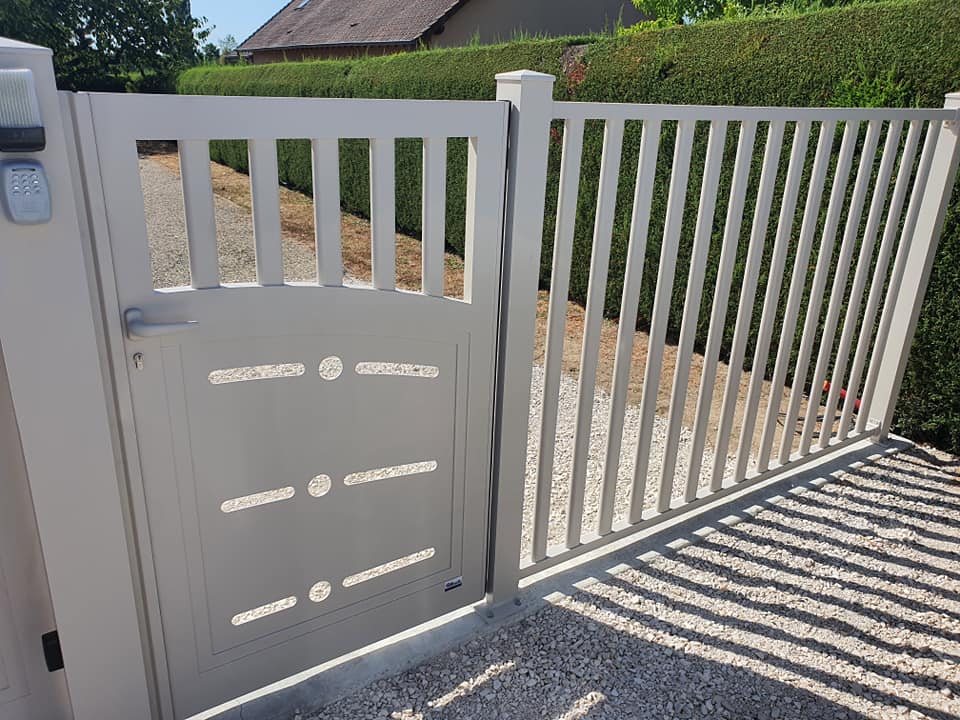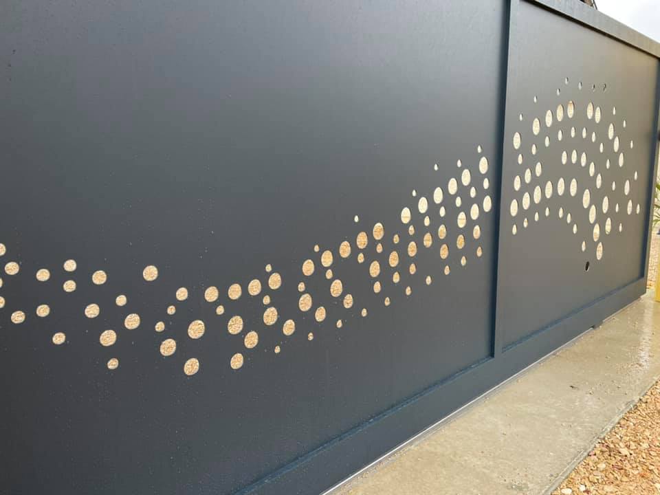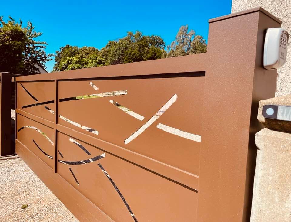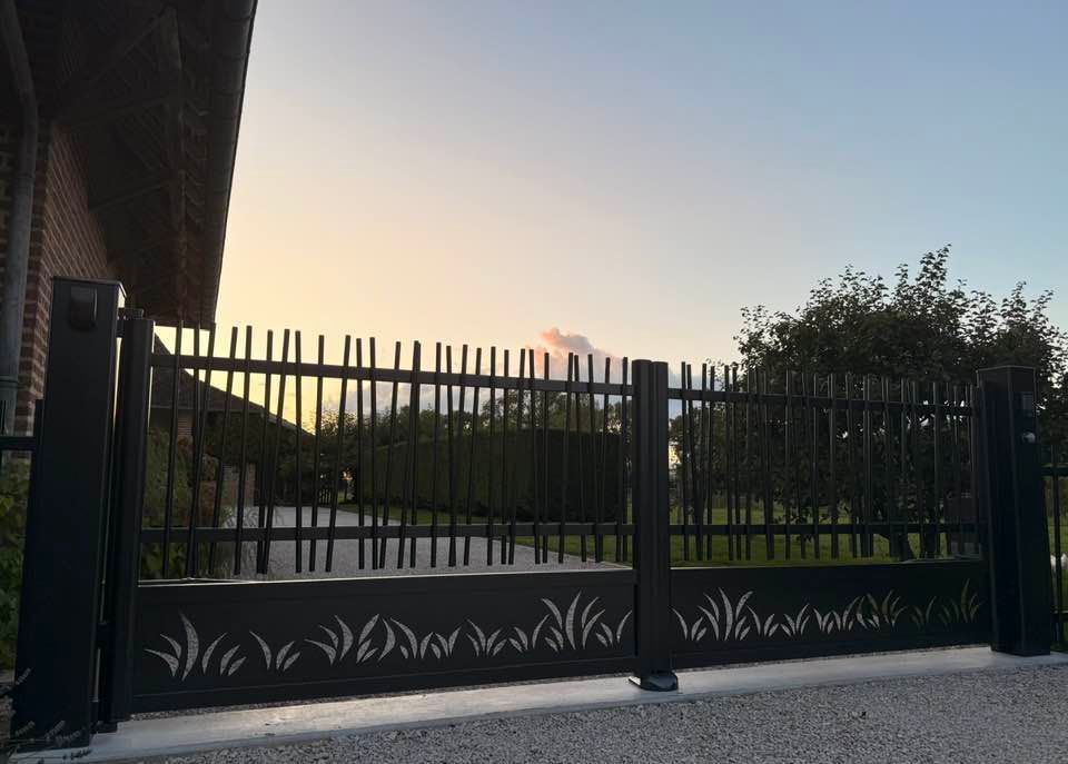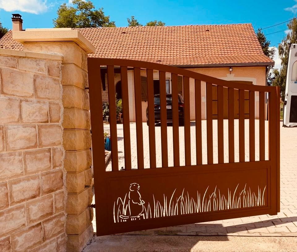 - clôture , portillon et portail avec motif personnalisé en découpe jet d’eau.