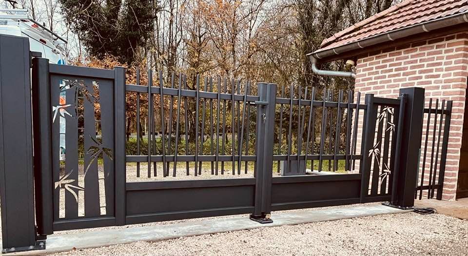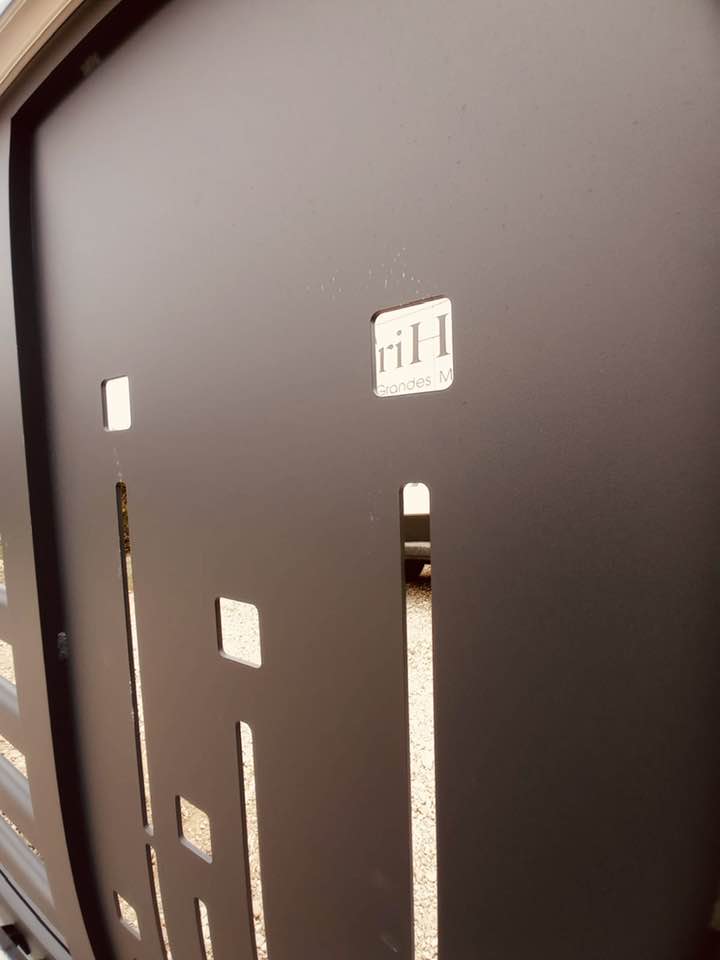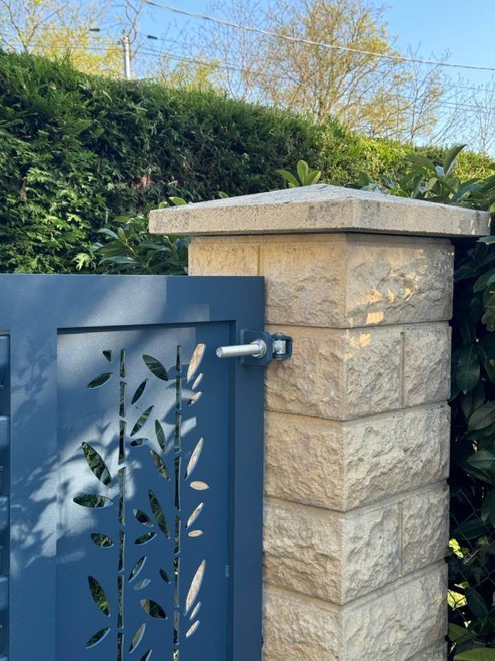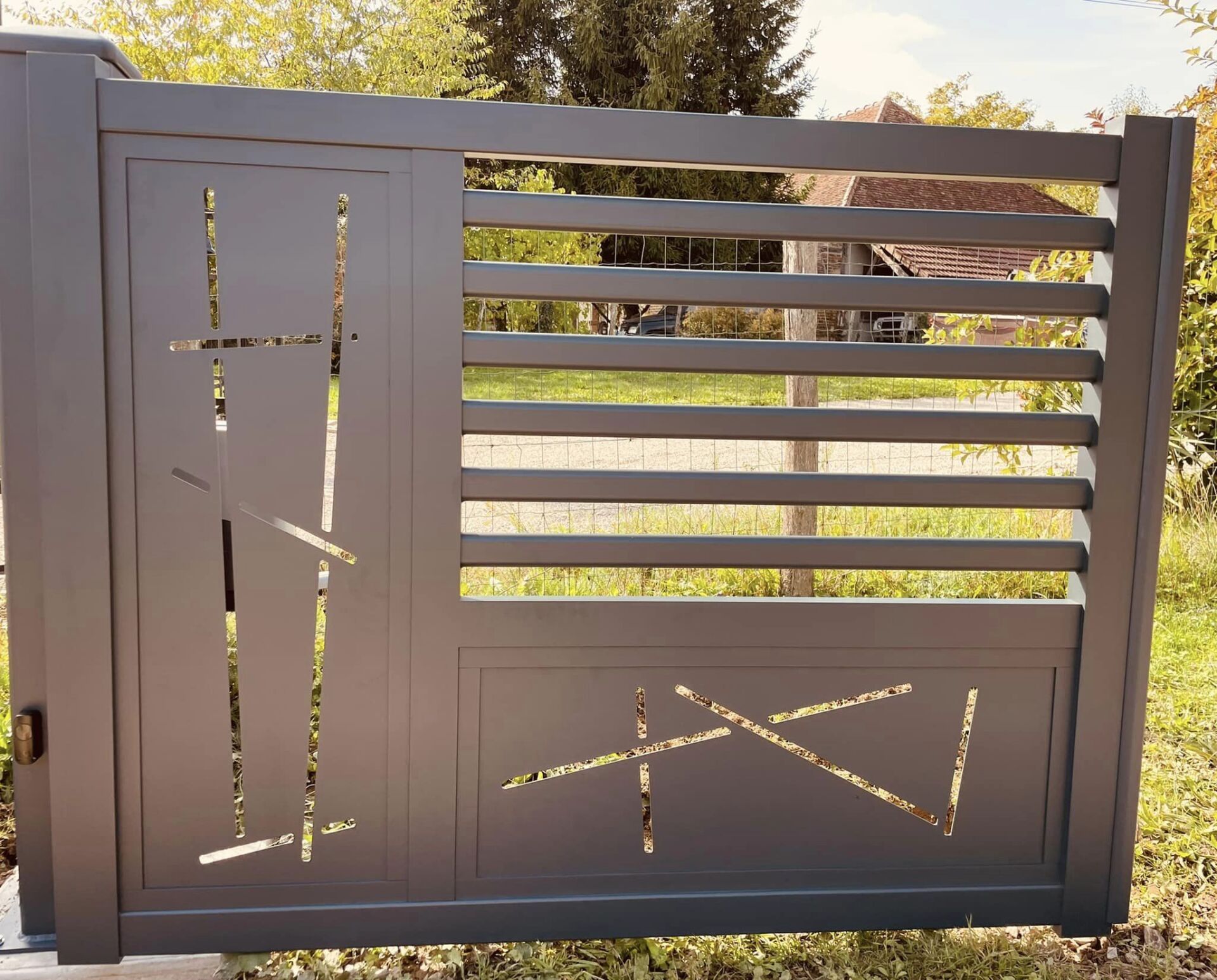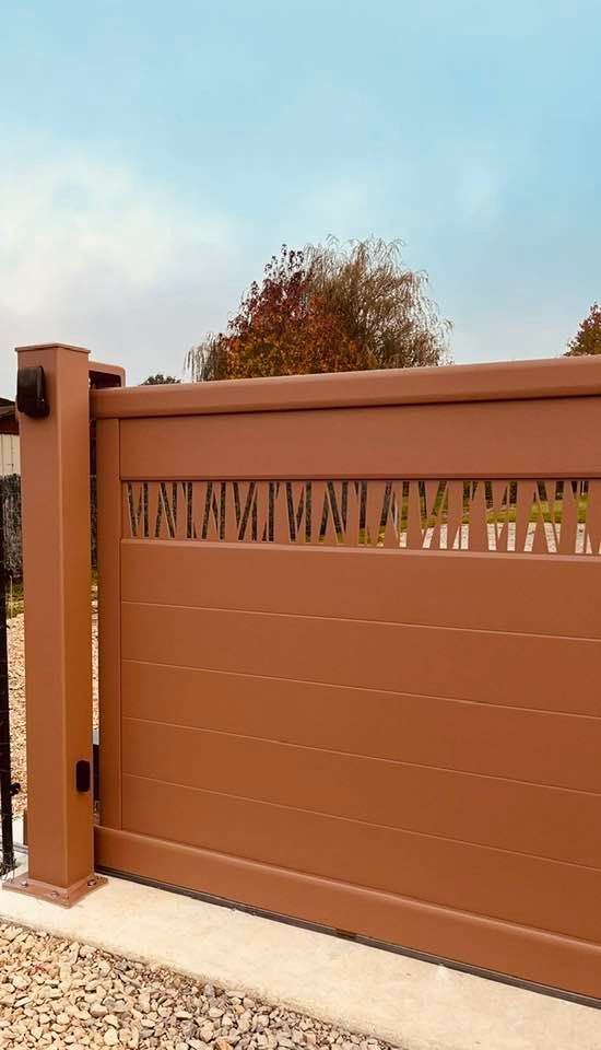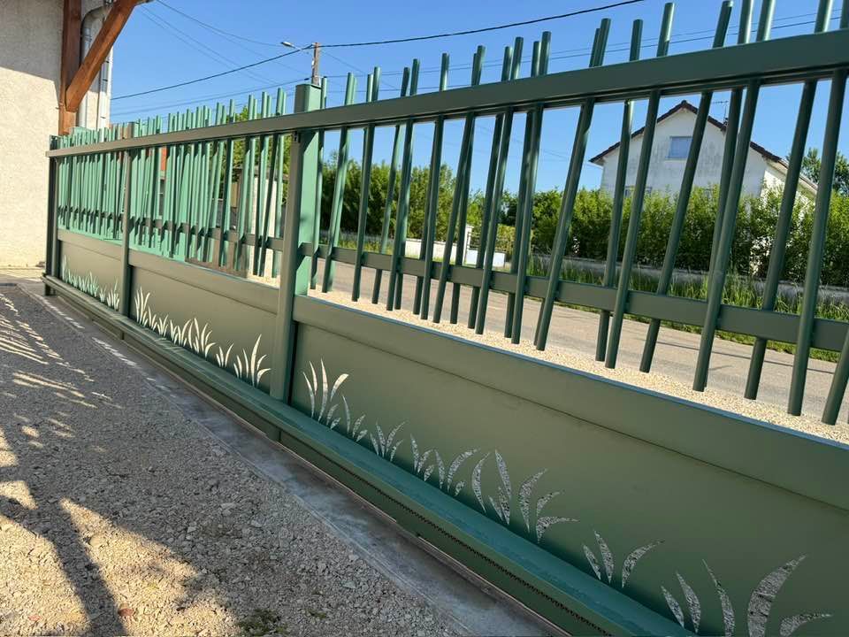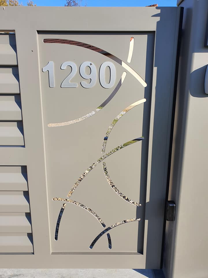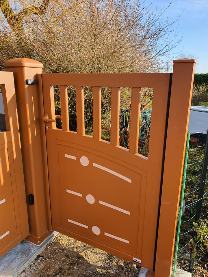 - clôture , portillon et portail avec motif personnalisé en découpe jet d’eau.