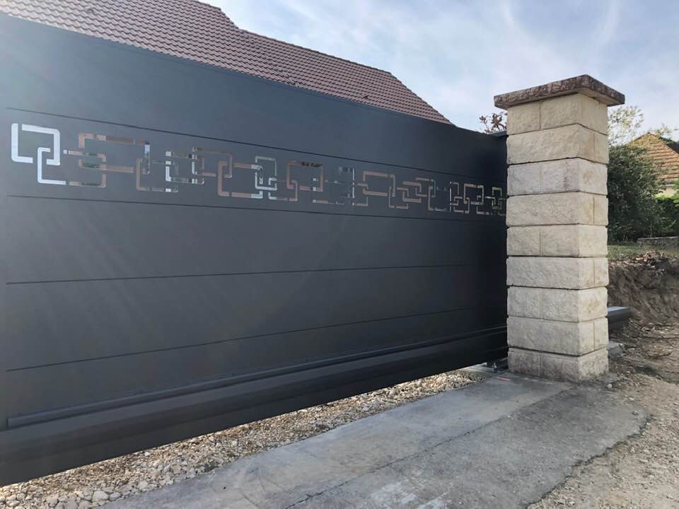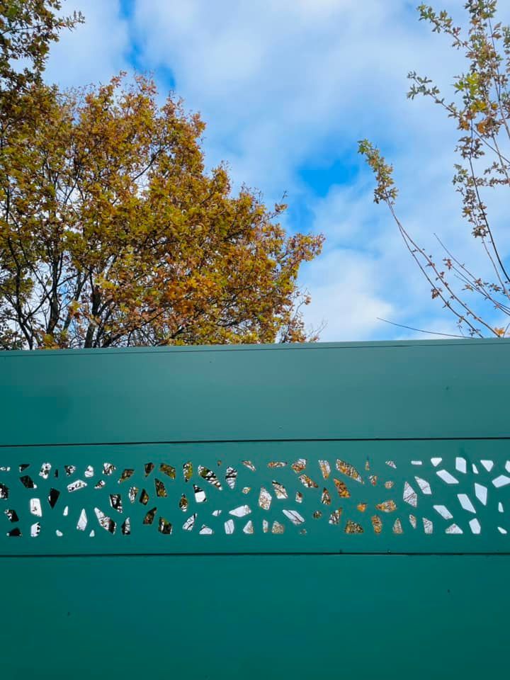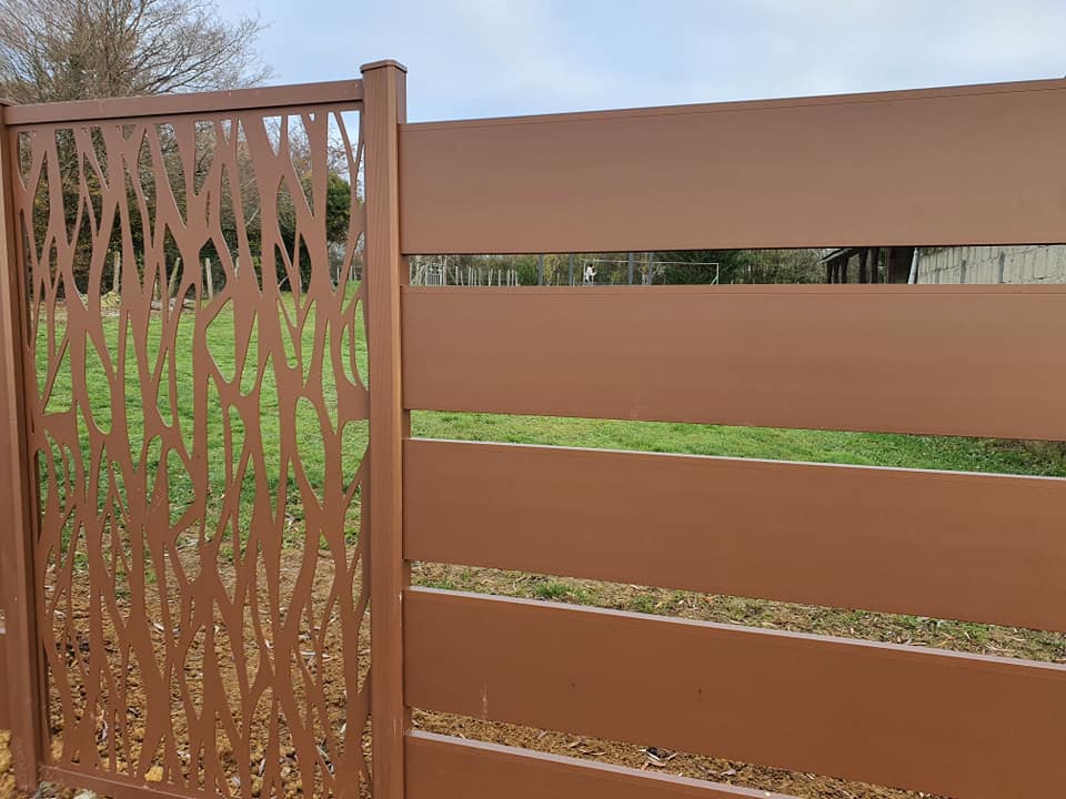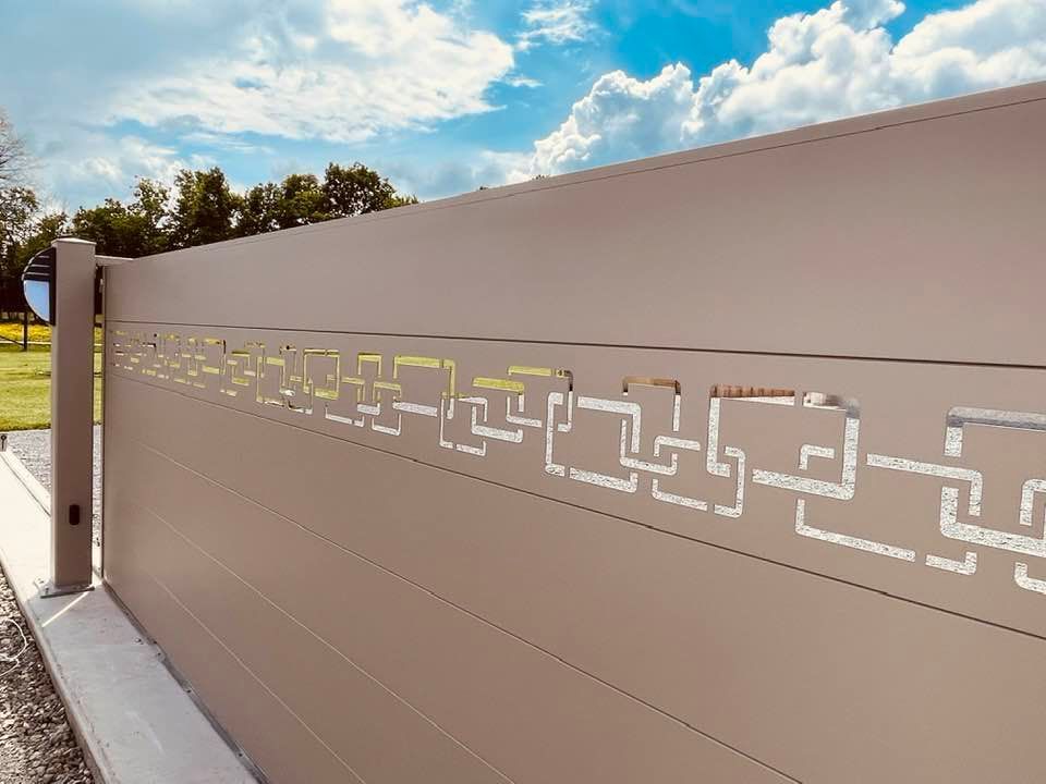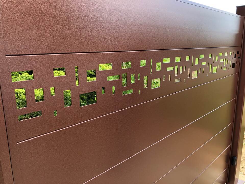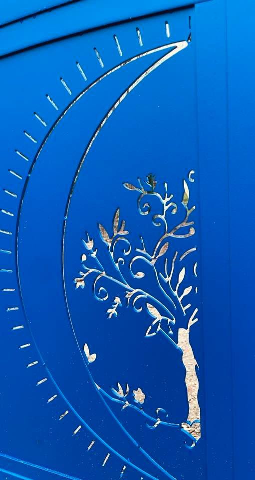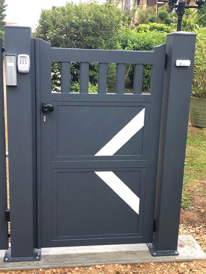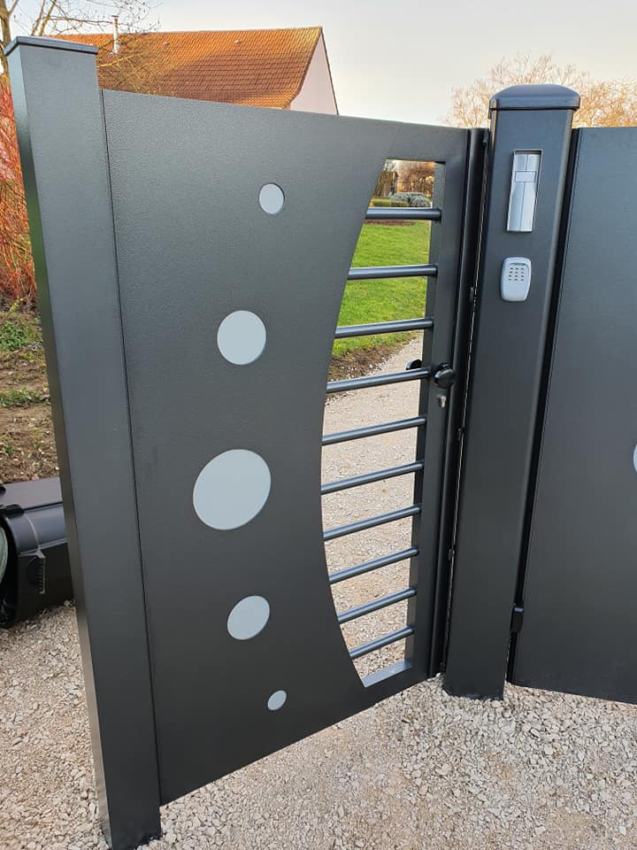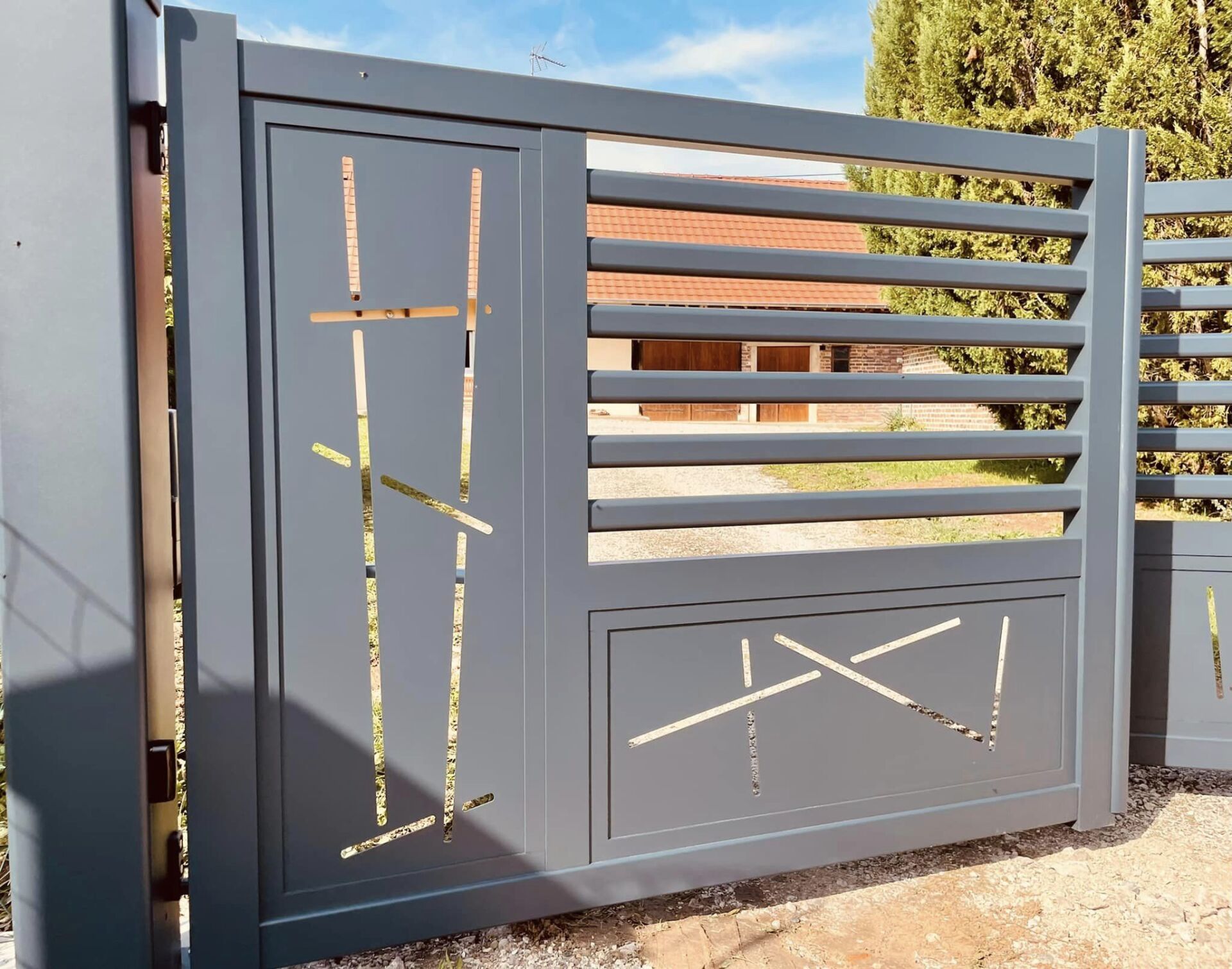 - clôture , portillon et portail avec motif personnalisé en découpe jet d’eau.