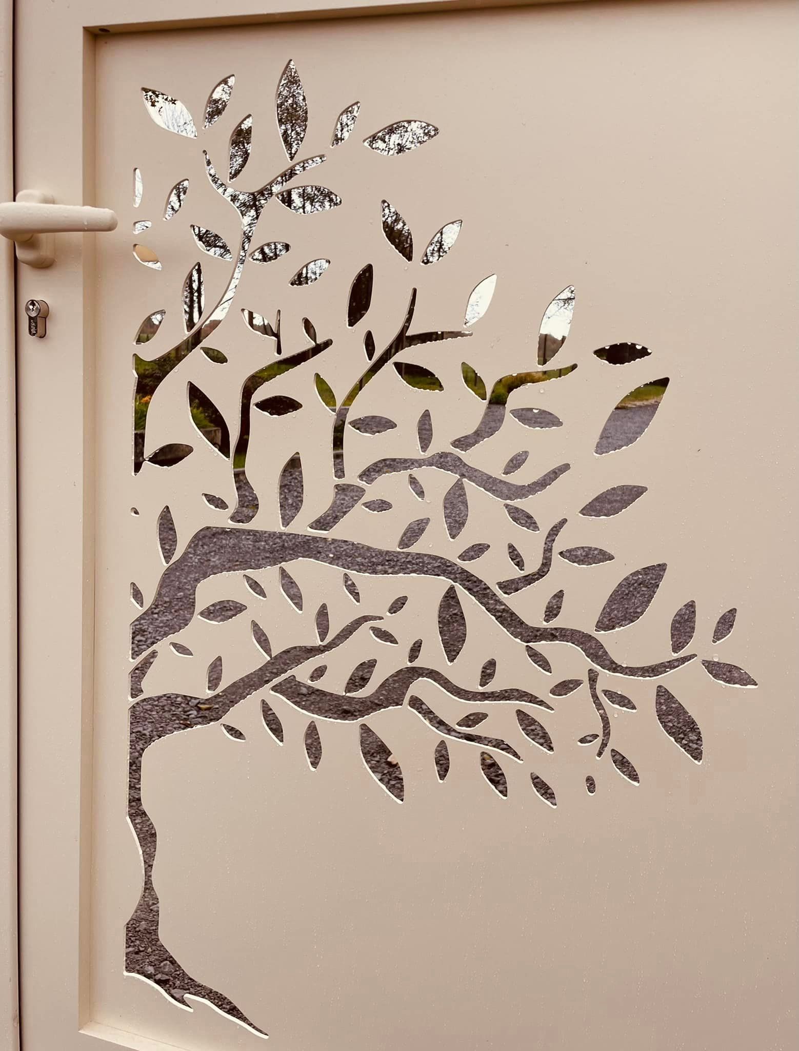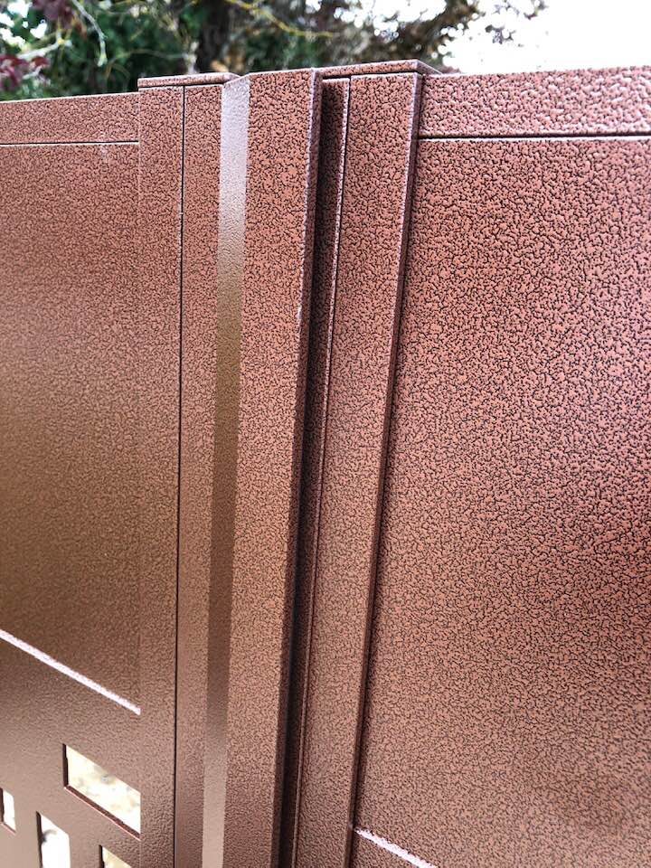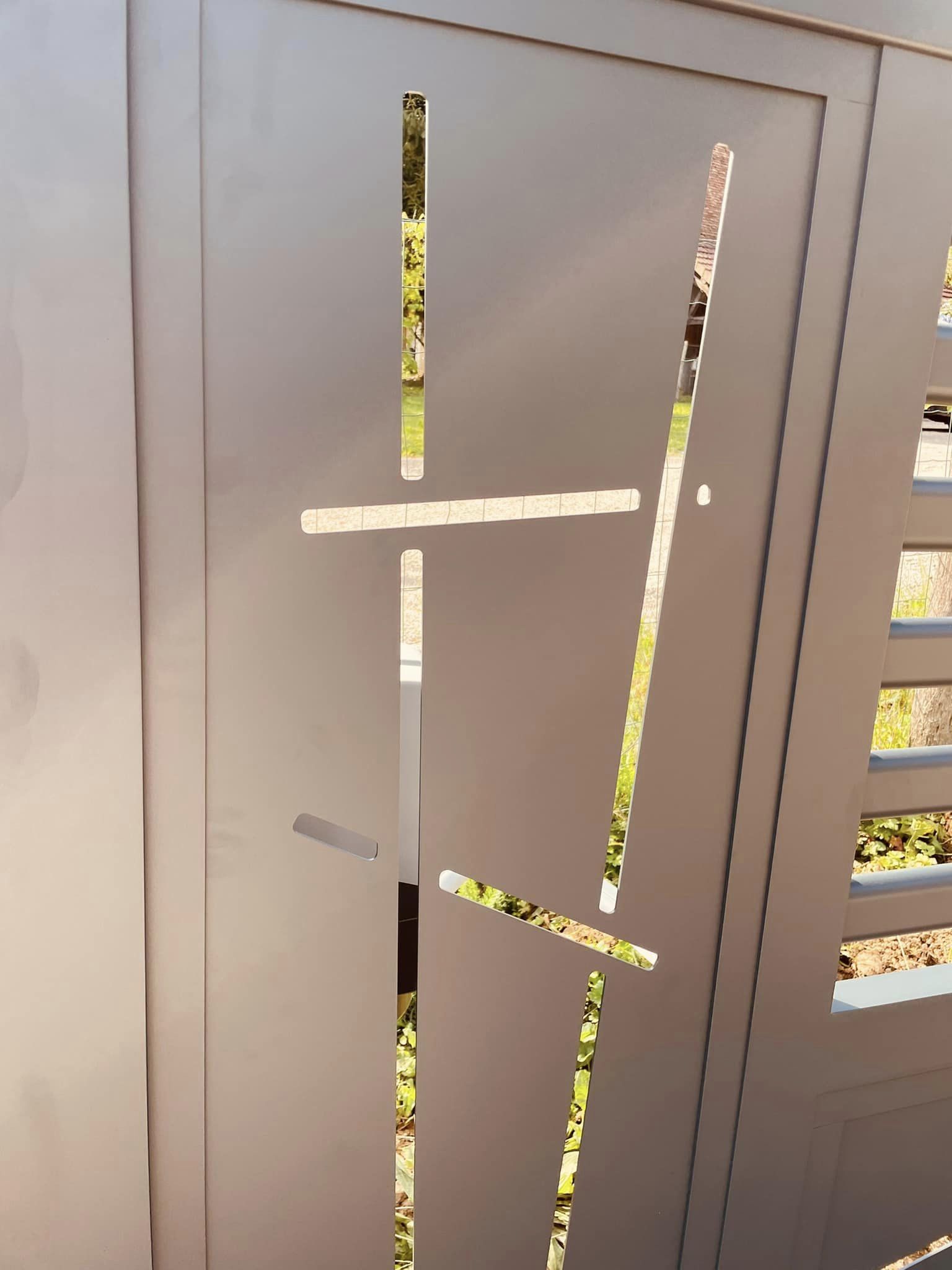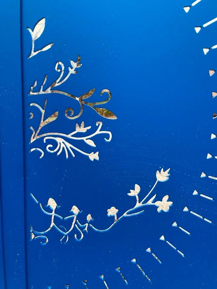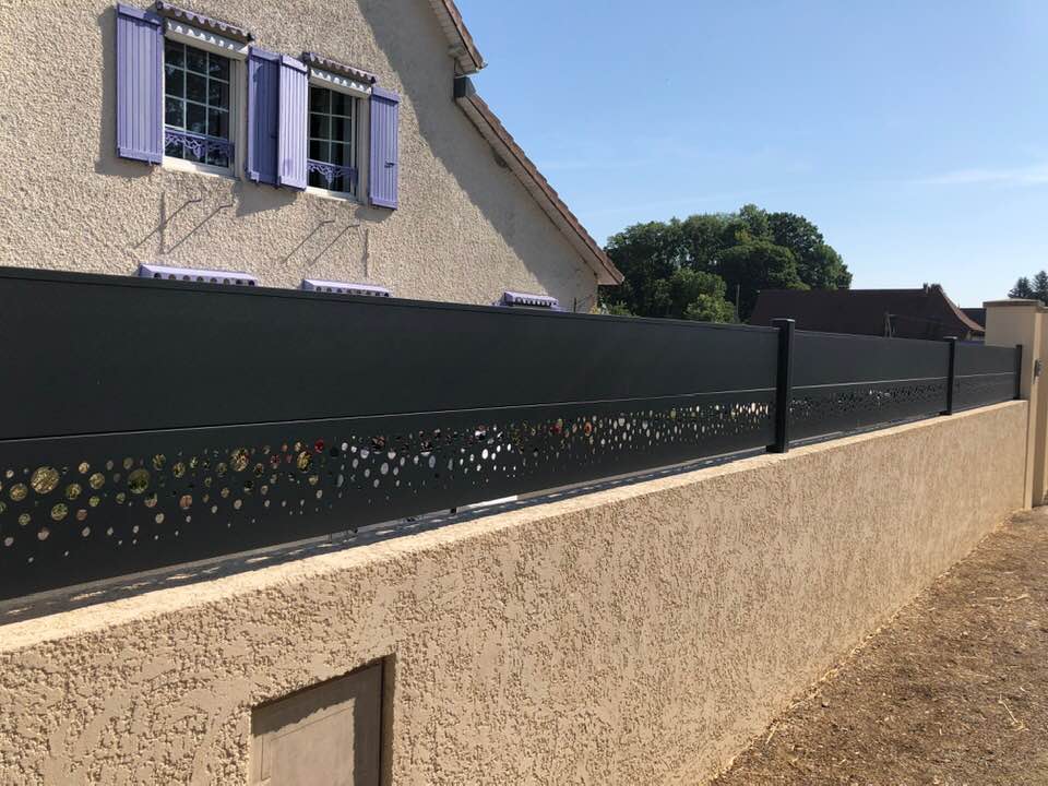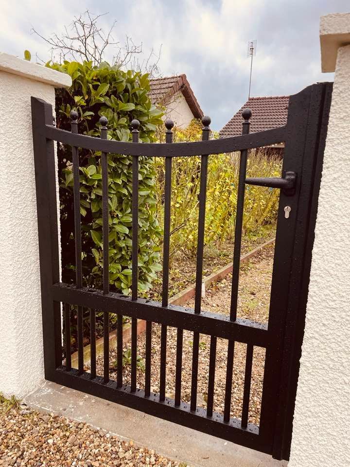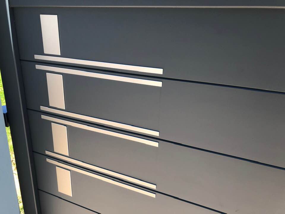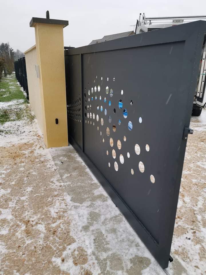 - clôture , portillon et portail avec motif personnalisé en découpe jet d’eau.