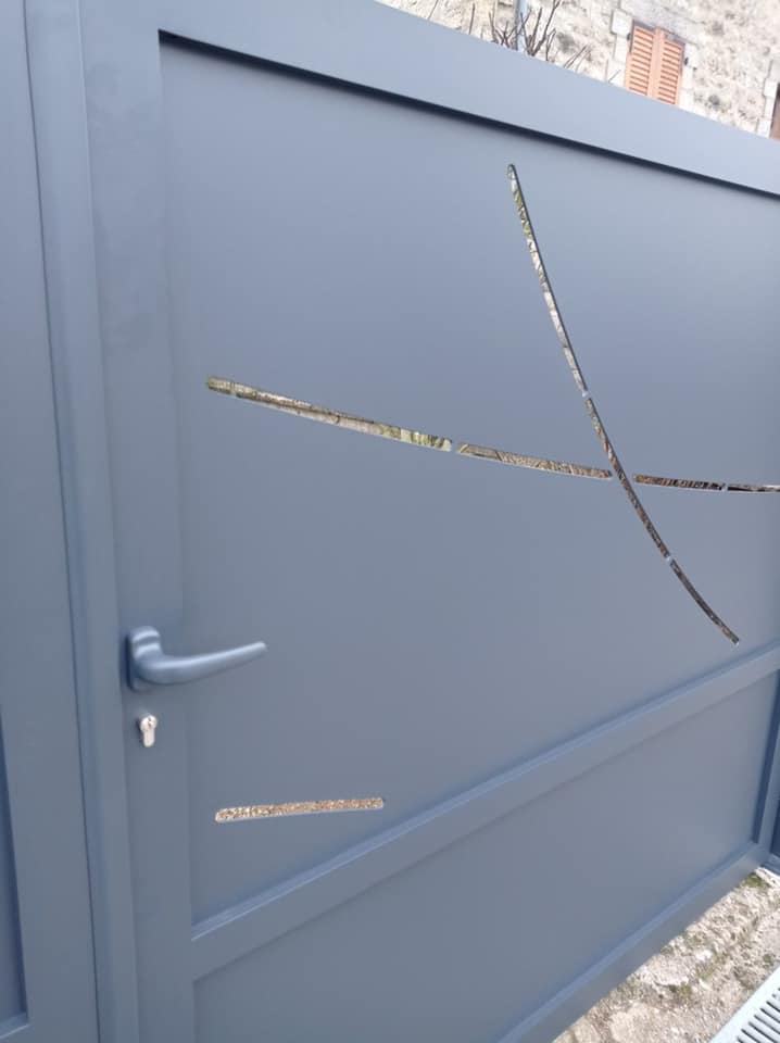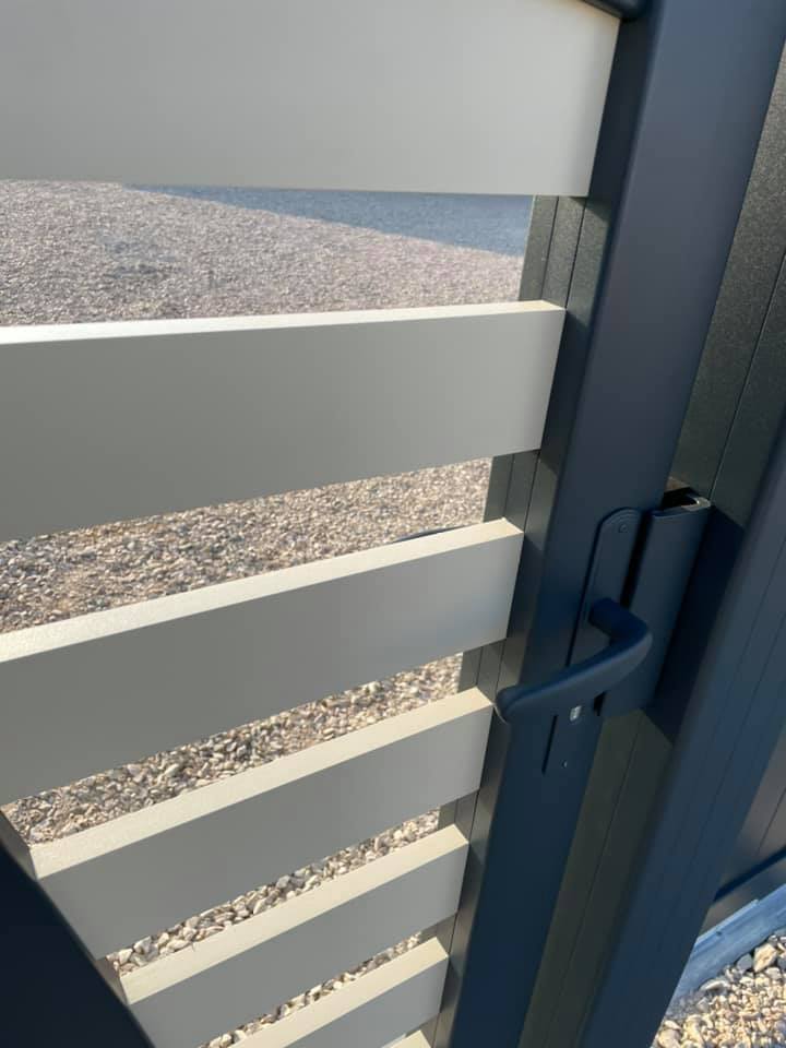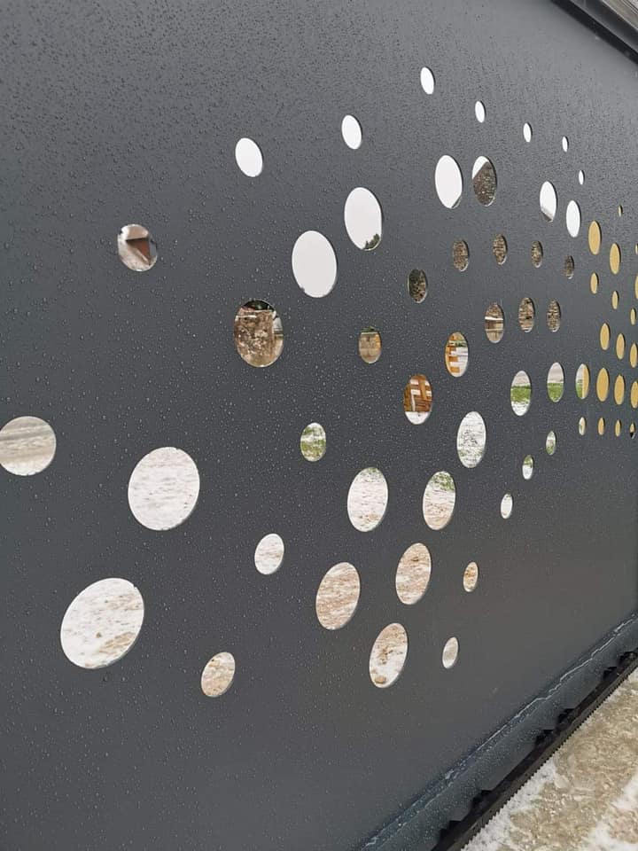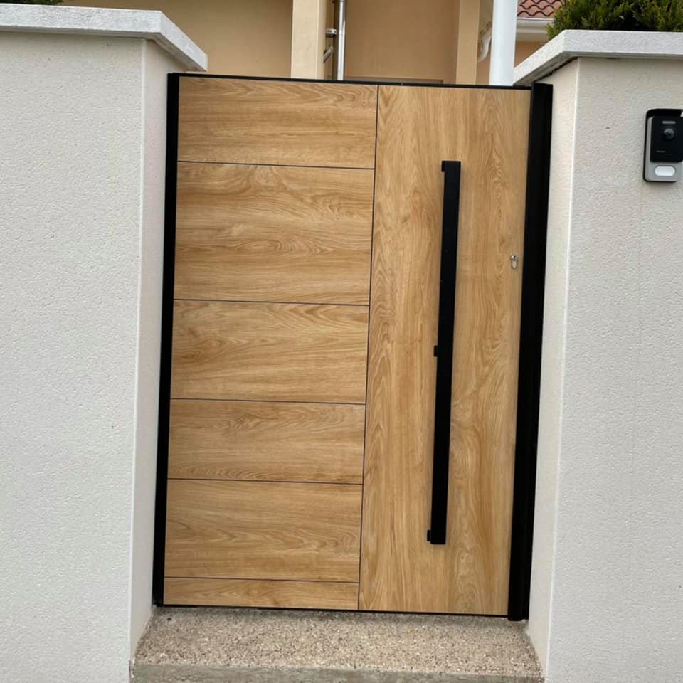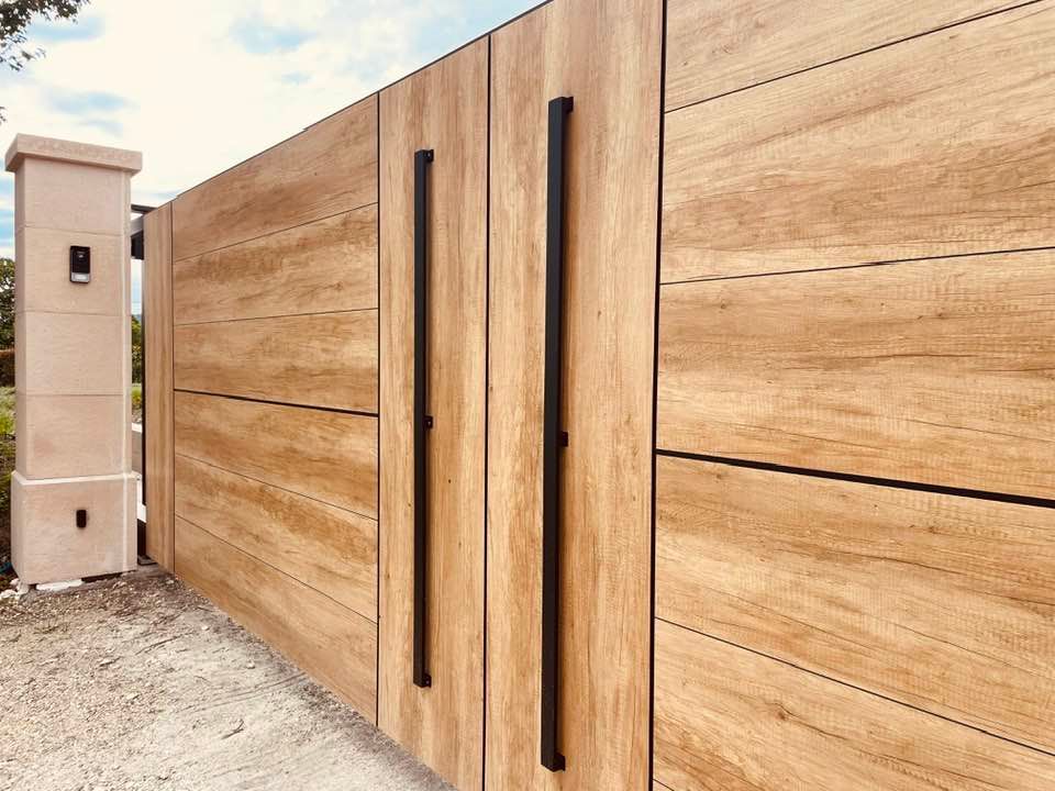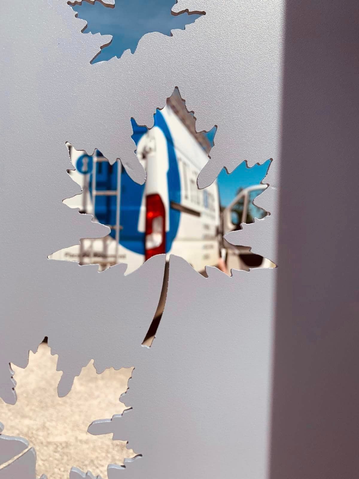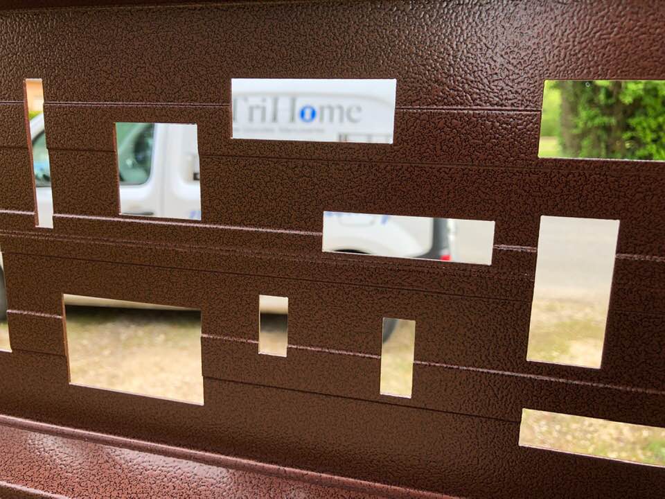 - clôture , portillon et portail avec motif personnalisé en découpe jet d’eau.