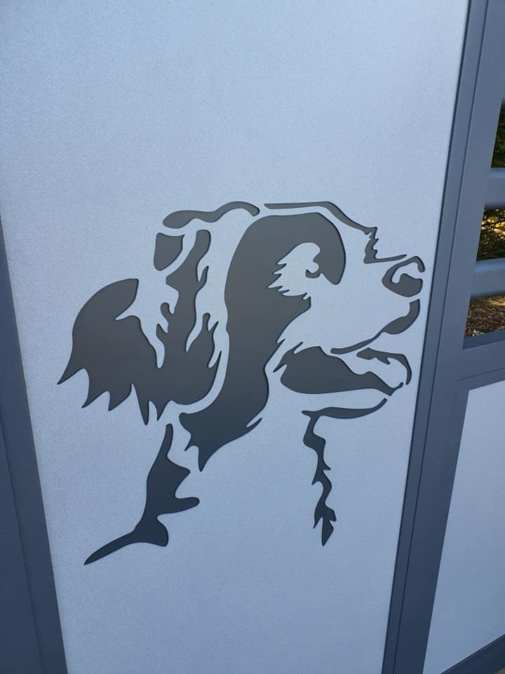 À Branges (71) un bel épagneul trône sur le tout nouveau portail aluminium sur mesure de nos clients.😍