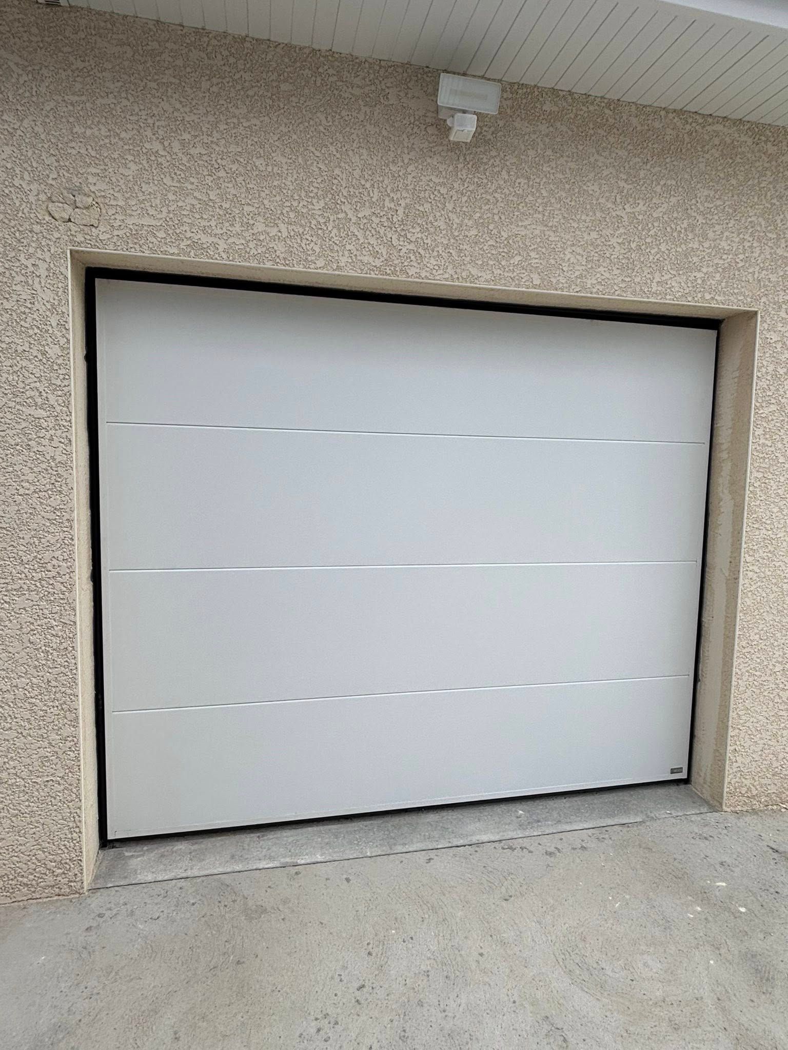 Il s'agit de la pose d'une porte de garage sur mesure grande largeur et motorisée.