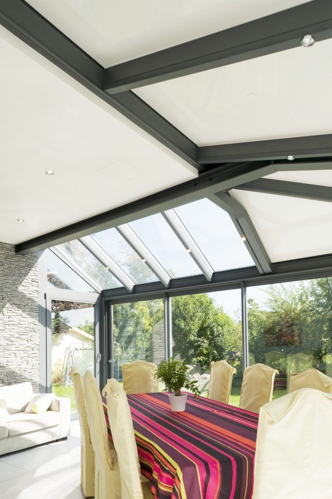 Avec ses chevrons apparents, c’est une véranda avec toiture à inertie par le dessous qui est très élégante. Elle permet de créer un nouvel espace de vie très confortable où peuvent être intégrés climatisation et stores.